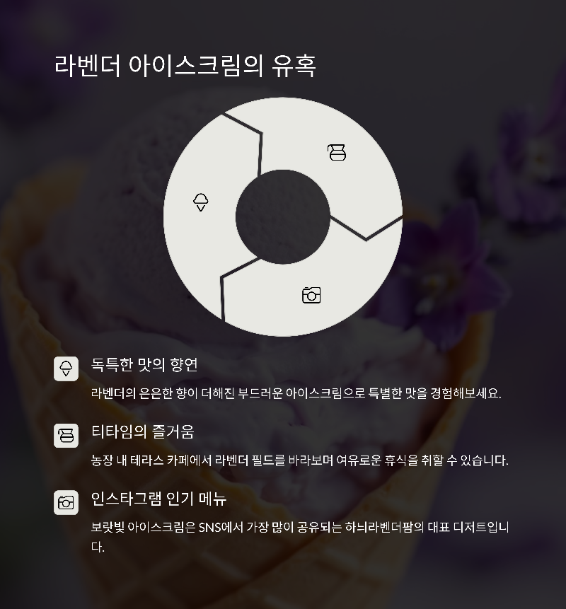 라벤더가 가득한 보랏빛 풍경 속을 걷고, 향기로운 체험과 여유로운 시간을 통해 일상의 스트레스를 잊어보세요.