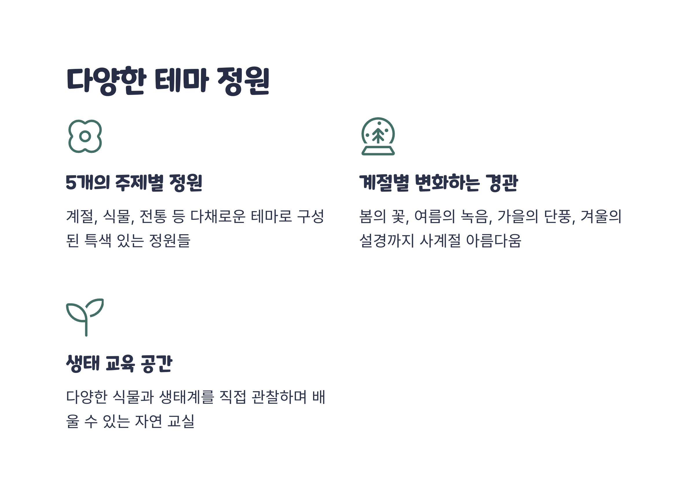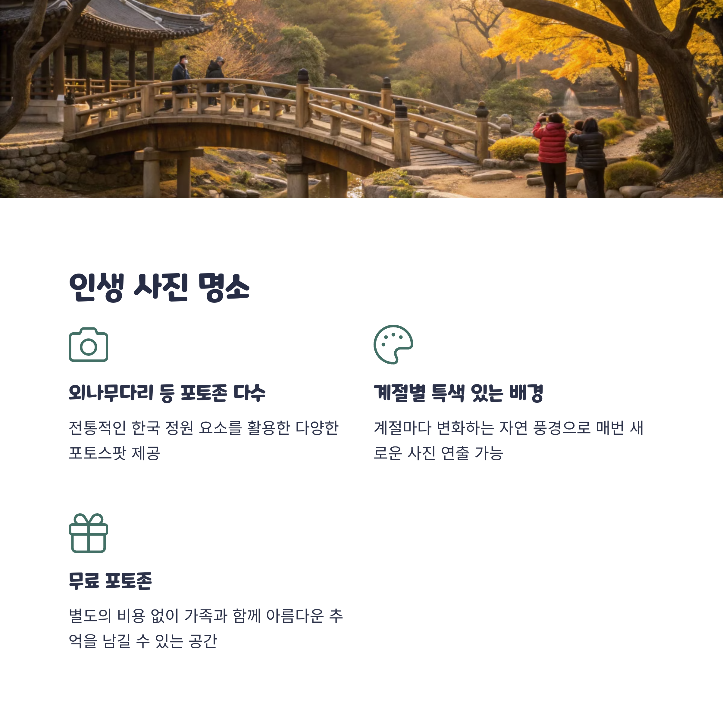 네, 봄에는 꽃과 새싹, 여름에는 배롱나무와 연못, 가을엔 단풍, 겨울엔 설경까지 계절별로 다른 분위기를 즐길 수 있습니다.