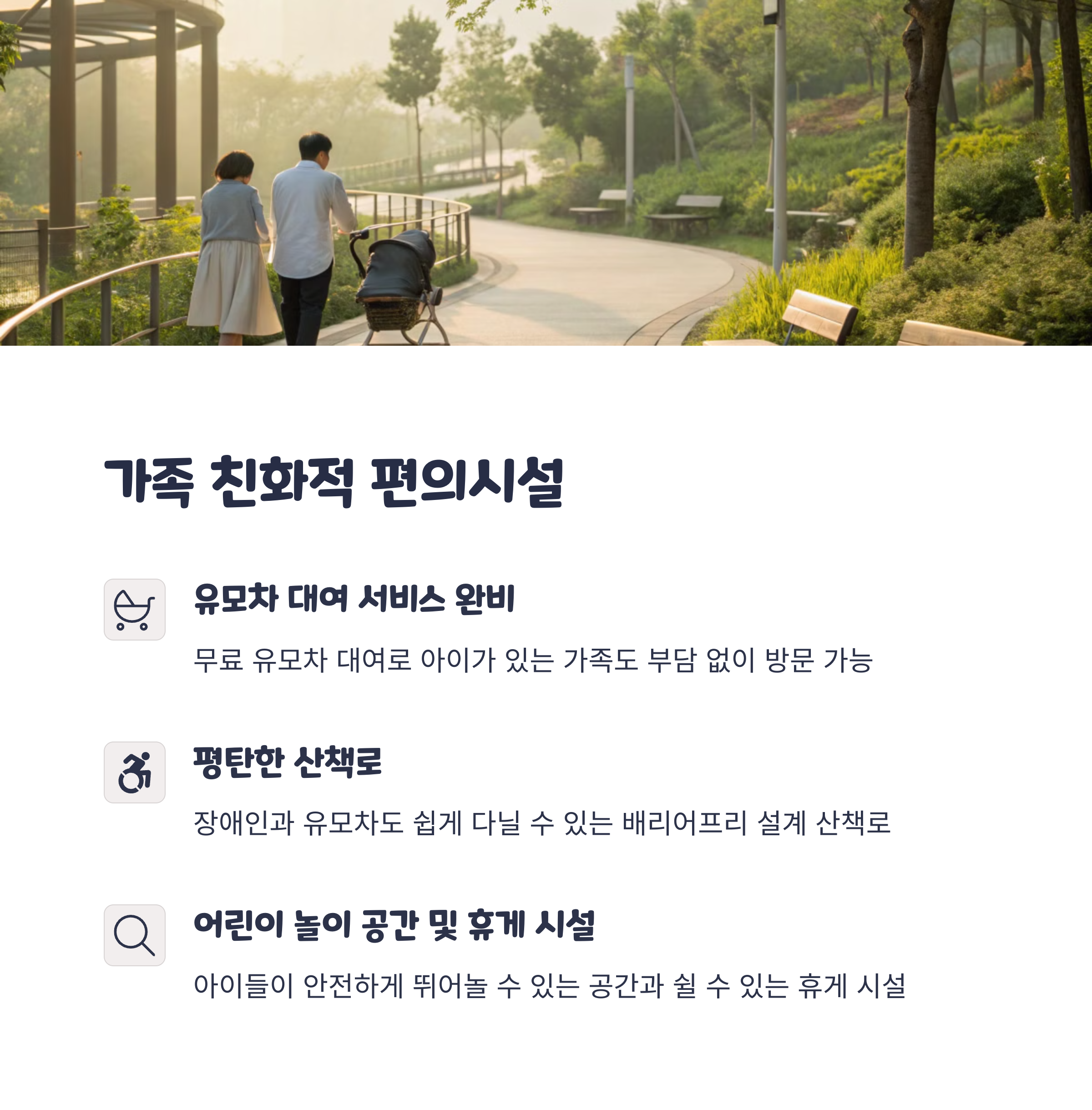 네, 유모차 이용이 가능한 코스와 수유실, 쉼터가 잘 마련되어 있어 어린 자녀와의 방문에도 전혀 무리가 없습니다.