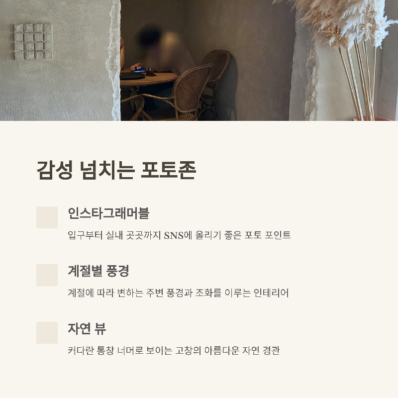 | 주요 특징 | 넓은 공간, 감성 포토존, 애견동반 가능, 특산물 메뉴 |