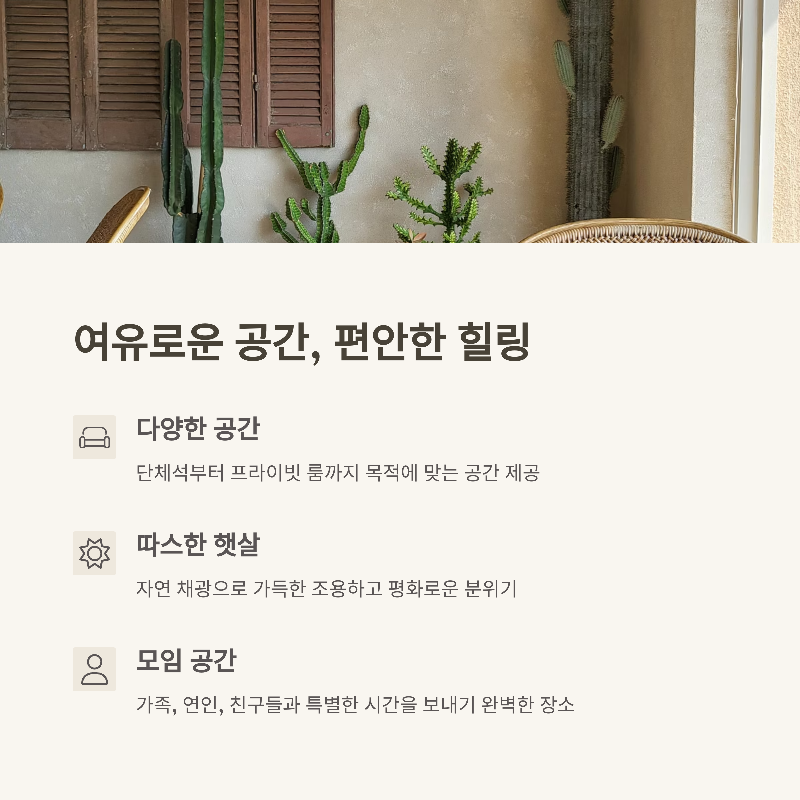 | 시즌별 꾸밈으로 재방문에도 신선함 유지 | 지역 농가와 연계된 재료 사용으로 건강한 맛 제공 | 야외 공간도 마련되어 있어 반려견 산책도 가능 |