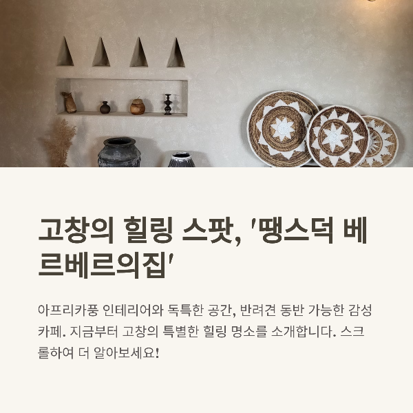 전라북도 고창은 자연과 문화가 조화를 이루는 아름다운 여행지로 잘 알려져 있습니다. 역사적인 유적지와 고즈넉한 풍경이 여행자들의 마음을 사로잡는 가운데, 최근 고창을 찾는 많은 이들이 주목하는 특별한 카페가 있습니다. 바로 땡스덕 베르베르의집입니다. 아프리카풍의 독특한 외관과 넓고 여유로운 공간, 감성적인 인테리어로 꾸며진 이 카페는 단순한 음료를 마시는 곳을 넘어 여행의 하이라이트가 되는 경험을 선사합니다. 직접 방문한 저는 카페의 포토존, 메뉴 구성, 분위기 하나하나에서 정성이 가득 느껴졌고, 여유로운 오후를 보내기에 최적의 장소라고 확신했습니다. 특히 고창 특산물을 활용한 메뉴와 반려동물 동반이 가능한 환경은 다양한 여행객에게 큰 만족을 주었습니다. 오늘 포스팅에서는 땡스덕 베르베르의집을 고창 여행 코스로 선택해야 하는 이유를 생생한 경험과 함께 소개드리겠습니다. 실제 방문 후기와 리뷰 데이터, 이용 팁까지 꼼꼼히 담았으니 끝까지 읽어주세요!