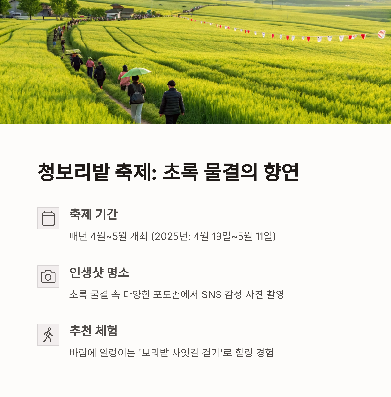 봄, 따뜻한 햇살과 함께 마음이 먼저 떠나는 곳이 있습니다. 바로 전라북도 고창인데요. 이곳은 봄이면 전국 방방곡곡에서 사람들이 모여드는 청보리밭과 고창읍성으로 유명합니다. 2024년 봄, 설레는 마음을 안고 고창으로 여행을 다녀왔습니다. 꽃샘추위가 지나고, 따스한 바람과 함께 초록이 짙어지는 계절에 걷는 청보리밭의 사잇길은 그야말로 힐링 그 자체였습니다. 수많은 인생샷을 남길 수 있는 포토존은 물론, 고창만의 역사와 스토리가 담긴 읍성 야경까지. 하루가 짧게만 느껴졌던 여정이었죠. 특히나 이번 2025 고창청보리밭축제는 4월 19일부터 5월 11일까지로, 지금이 딱 가기 좋은 시기입니다. 고창을 처음 찾으시는 분들도 쉽게 즐길 수 있도록 여행 코스, 축제 정보, 실속 꿀팁까지 꼼꼼히 정리해 드릴게요. 가족, 연인, 친구와 함께, 누구와 가도 좋은 봄 여행지 고창에서 소중한 추억을 만들어보세요.