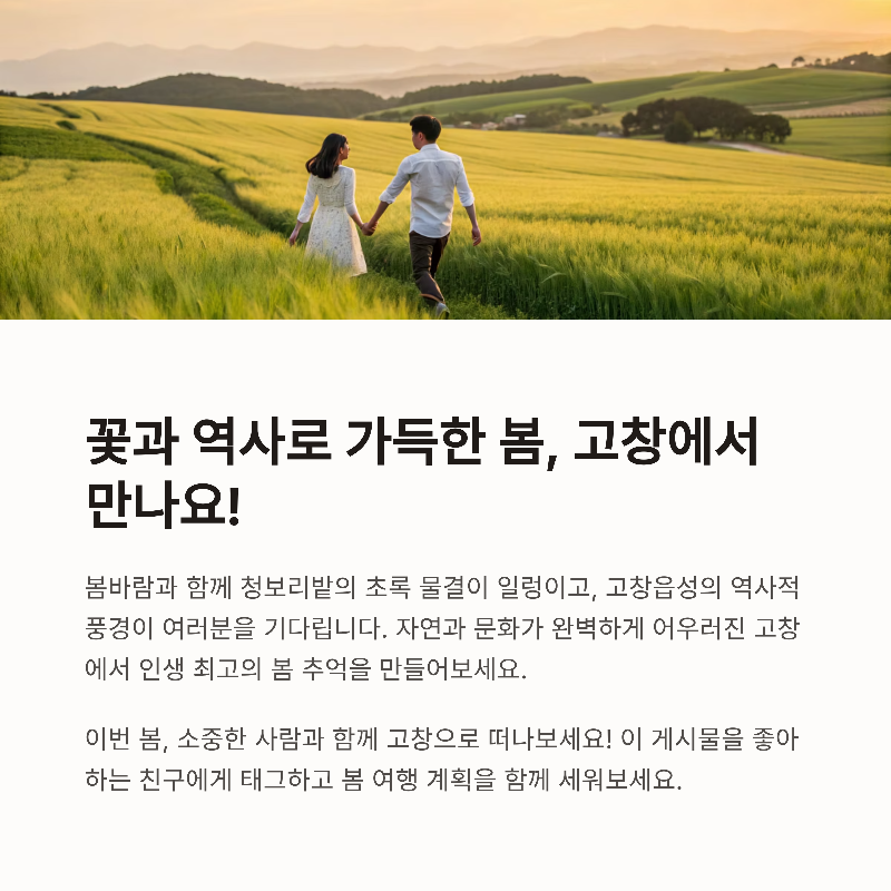 이번 봄, 고창 여행 어떠셨나요? 다녀오신 분들의 생생한 후기나 가보고 싶은 장소가 있다면 댓글로 남겨주세요! 여러분의 경험이 다음 여행자에게 큰 도움이 될 수 있어요.