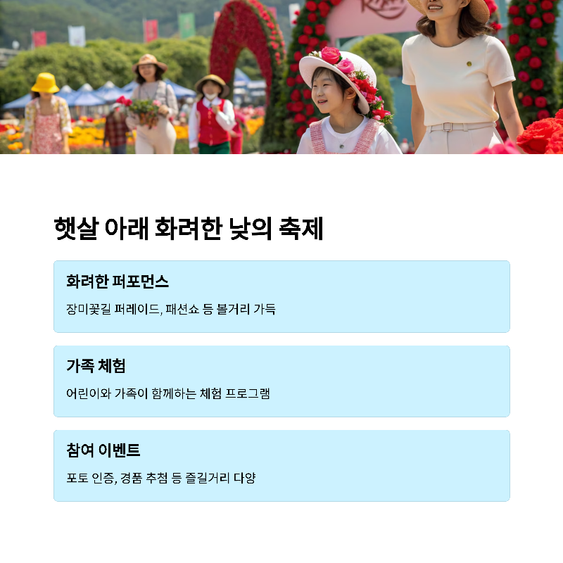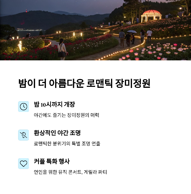 해가 저물 무렵, 축제장은 또 다른 분위기로 변신합니다. 조명으로 물든 장미정원은 몽환적이면서도 감성적인 분위기를 연출해 커플들에게 큰 인기를 끌죠. 포토존에서 함께 사진을 남기며 평생 기억에 남을 특별한 순간을 만들 수 있습니다. 특히 ‘핑크 로즈 아치길’과 ‘하트 프레임 포토존’은 SNS에서 이미 인증샷 성지로 통하는 곳이라 줄을 서서 촬영하는 이들도 많았어요. 저도 이곳에서 장미 아래 로맨틱한 한 컷을 남겼고, 밤하늘과 어우러진 장미길은 정말 영화 속 장면 같았답니다.