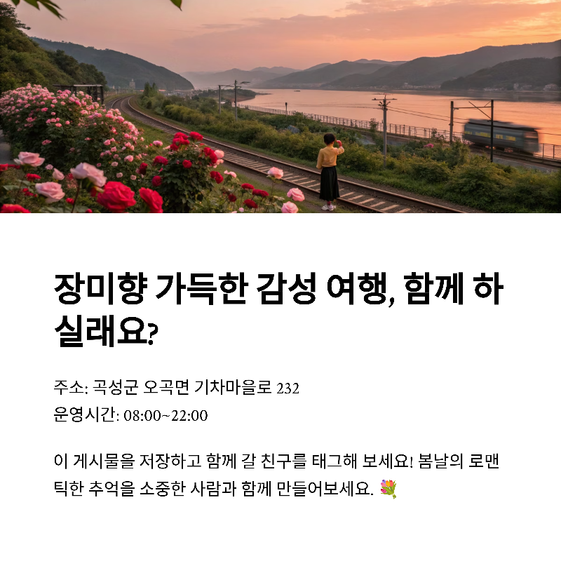 곡성 장미축제, 여러분은 어떤 순간이 가장 기억에 남았나요? 가족과 연인의 추억, 인생샷 스팟, 유익했던 체험 등 댓글로 여러분의 소중한 이야기를 함께 나눠주세요!