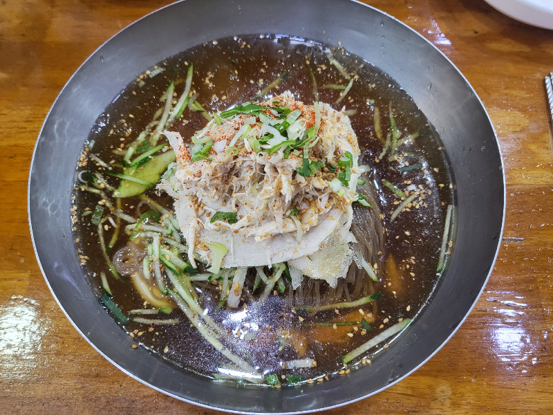 | 닭고기+돼지고기 간장 베이스 육수, 셀프 리필 가능 | 닭고기 찢은 살, 돼지고기 수육, 오이채 | 냉면 9,000~10,000원 / 왕만두 5,000원 |