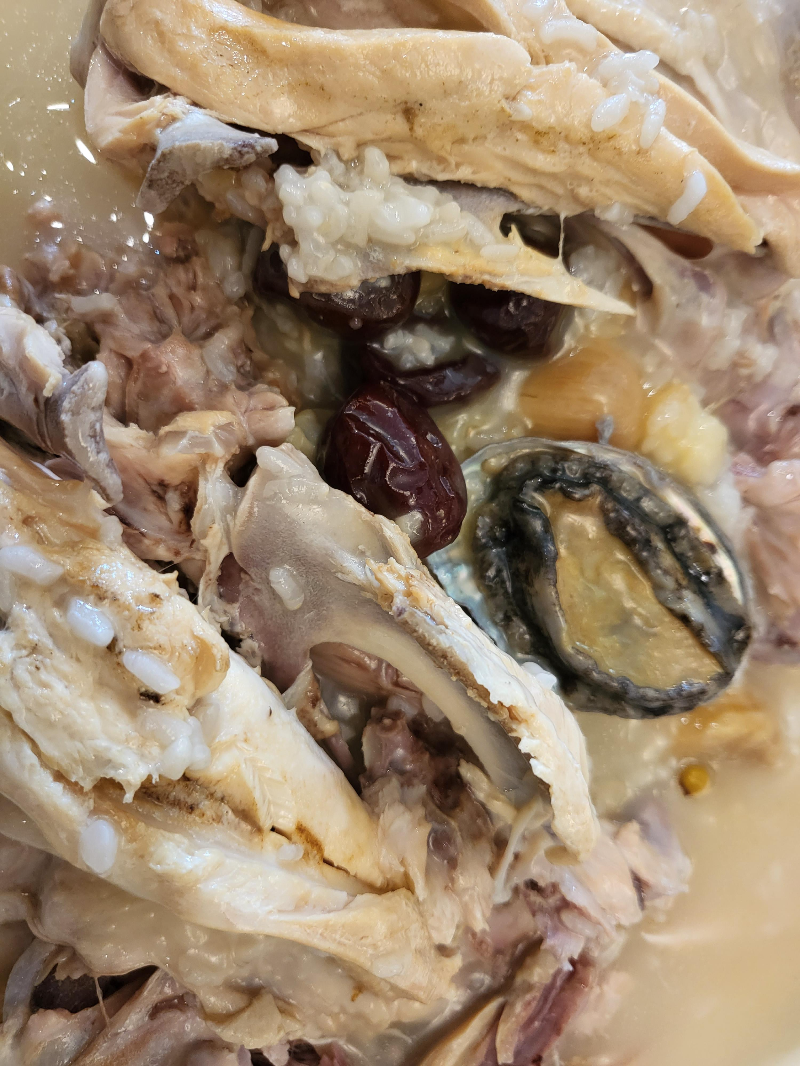 주문한 메뉴는 오리수육(소)과 오리누룽지백숙(대)이었는데요, 먼저 나온 오리수육은 잡내 없이 깔끔하고 고기가 아주 부드러웠어요. 부추와 쌈야채와 함께 먹으면 고소함이 배가되어 부모님께서 정말 만족하셨답니다. 이어 나온 누룽지백숙은 진하게 우러난 국물에 누룽지죽까지 곁들여져 있어서 몸에 좋다는 느낌이 절로 들었어요. 특히 닭고기가 너무 연하고 담백해서 아이들도 잘 먹더라고요.