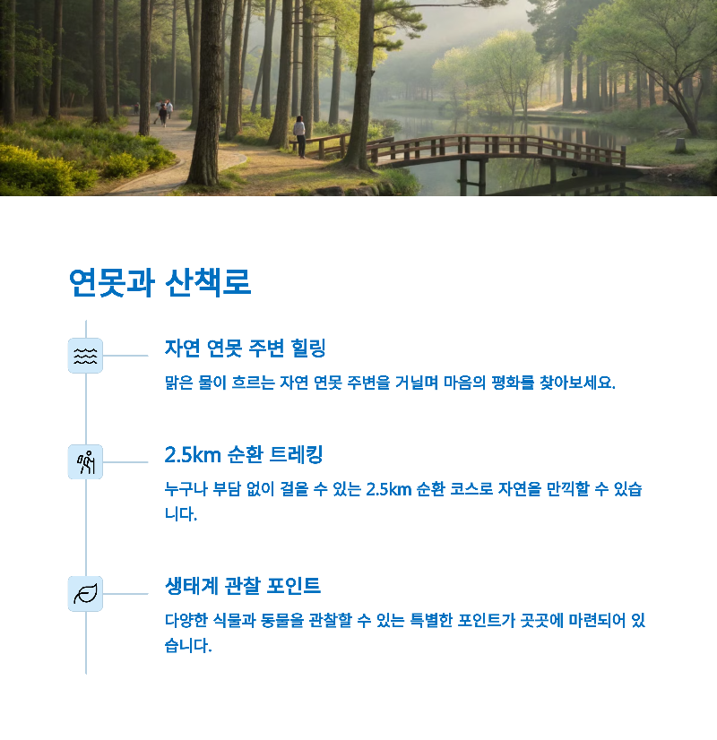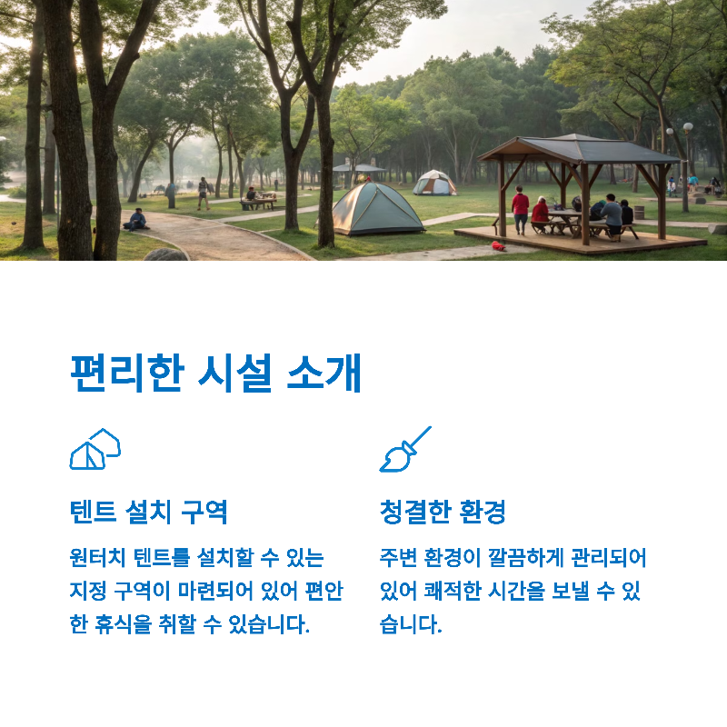 | 피크닉 포인트 | 평상 주변과 연못 인근, 텐트 설치 가능한 구역 정리 |
