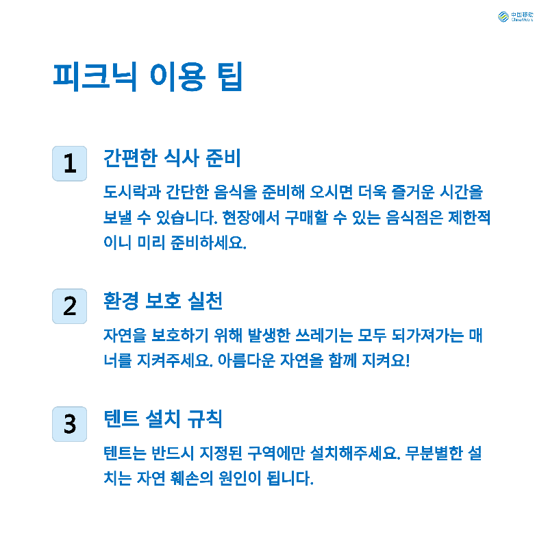 | 피크닉 장소 | 원터치 텐트 | 접근성 |