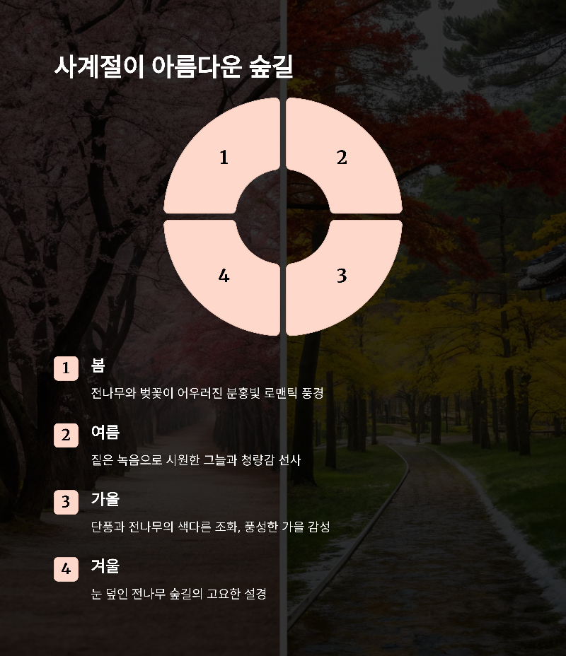 | 서울 기준 차량 3시간, 입구 주차 후 도보 20분 | 국내 3대 전나무 숲길 중 하나로 평가받음 | 3월 말~4월 초 방문 시 벚꽃 절정 |