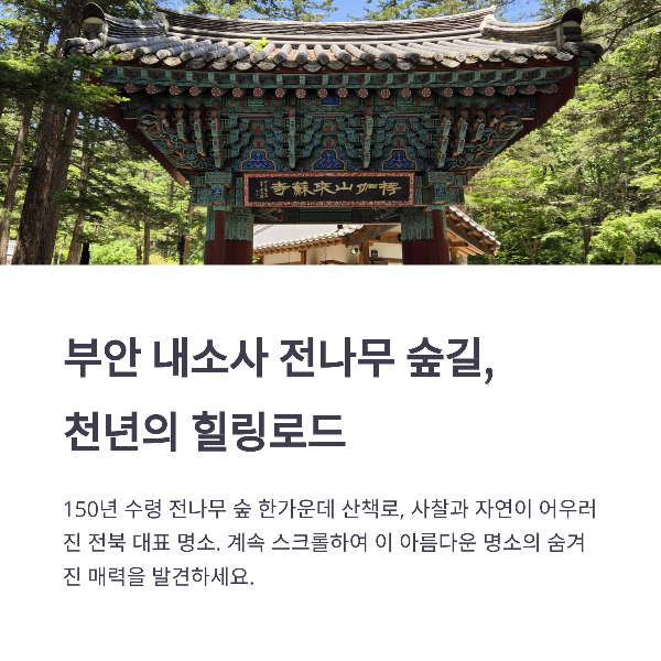 직접 다녀온 내소사 전나무 숲길은 단순한 관광지를 넘어선 감동의 공간이었습니다. 울창한 전나무 사이를 걷다 보면 마치 초록빛 터널 속에서 자연과 하나 되는 듯한 느낌을 받을 수 있습니다. 특히 봄철 벚꽃과의 조화는 이곳을 단연코 전국 최고의 힐링 명소로 만들어주기에 충분합니다. 짧은 시간 안에 깊은 여운을 남기고 돌아올 수 있는 여행지로서, 가족과 연인은 물론 나 홀로 여행을 계획하는 분들에게도 강력히 추천드립니다. 자연과 역사, 여유와 치유를 모두 경험할 수 있는 내소사, 여러분도 꼭 한 번 걸어보시길 바랍니다.