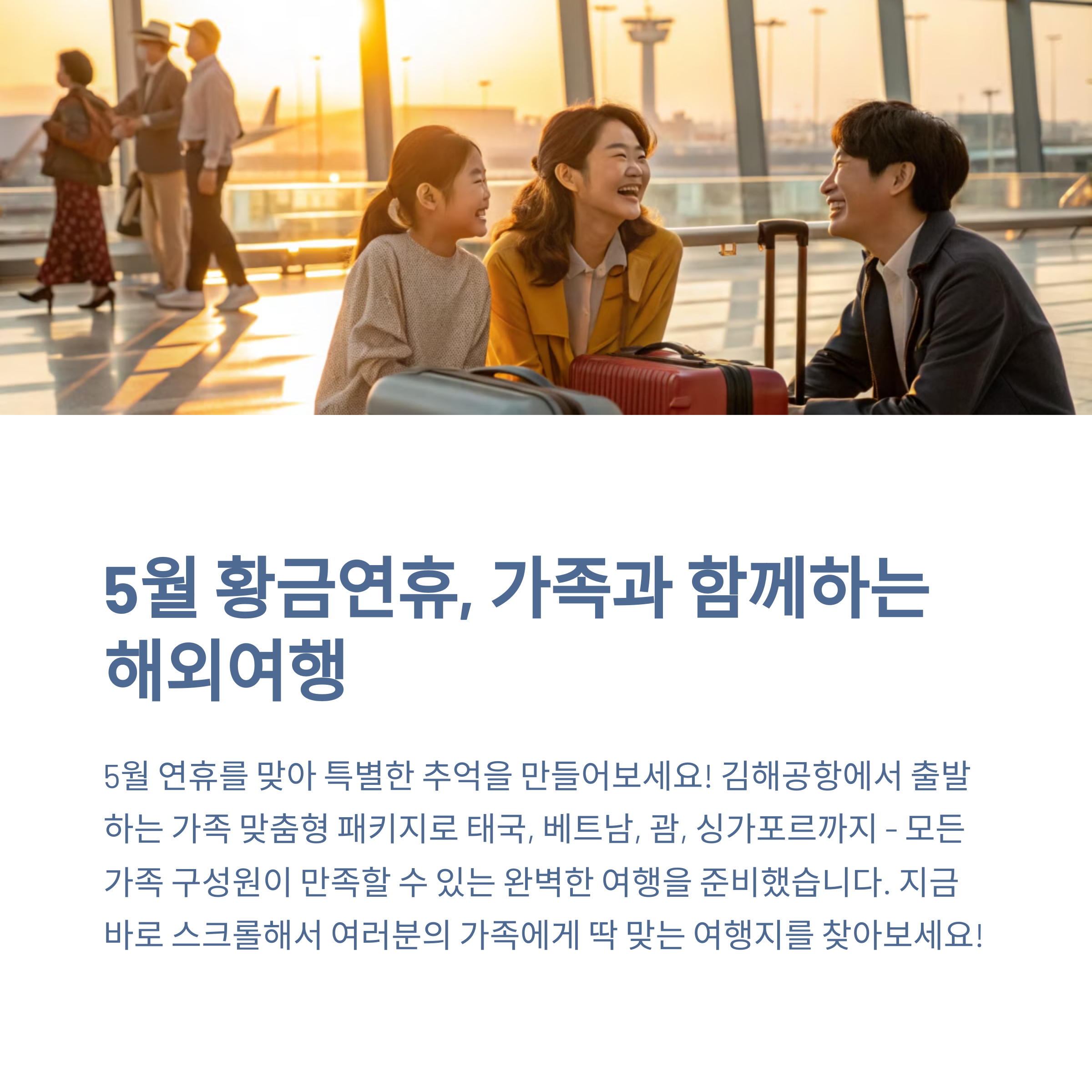 5월 황금연휴를 활용한 해외 가족여행은 더 이상 망설일 이유가 없습니다. 김해 출발 노선을 이용하면 이동의 번거로움을 줄이고, 부모님, 아이들 모두 만족할 수 있는 다양한 패키지 옵션이 있어 선택의 폭도 넓습니다. 이번 여행을 통해 저 역시 가족과 더 끈끈한 유대감을 느낄 수 있었고, 여행 후 아이가 “다음엔 또 어디 가요?”라며 기대감을 보일 만큼 즐겁고 만족스러운 일정이었습니다. 혹시 여행을 고민 중이라면 이번 5월, 마음 편히 떠나보시는 건 어떨까요? 온 가족이 함께 웃을 수 있는 여행, 지금 바로 준비해보세요!