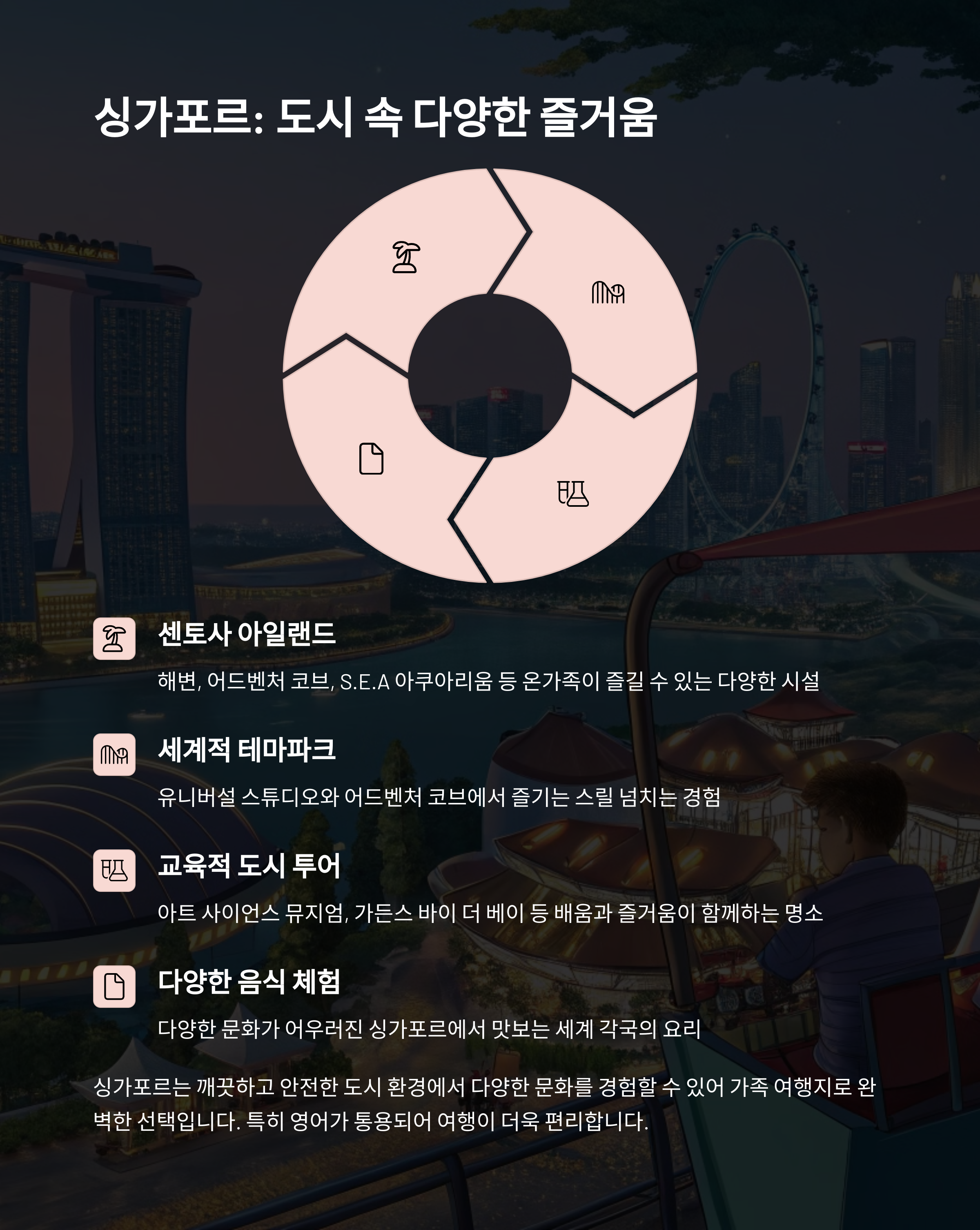괌과 싱가포르도 가족 여행지로 손색이 없습니다. 괌은 이동 거리가 짧아 부모님께 부담이 적고, PIC 리조트에서의 자유 시간은 아이와 함께 물놀이하기에 최적이었습니다. 반면 싱가포르는 도시적 매력을 갖춘 동시에 센토사섬과 루지 체험 같은 놀이 요소도 다양해 가족 모두가 만족할 만한 구성을 갖추고 있었죠. 실제로 제가 싱가포르를 여행했을 당시, 마리나 베이의 야경은 부모님과 함께 손을 잡고 산책하기에 정말 낭만적인 장소였습니다.