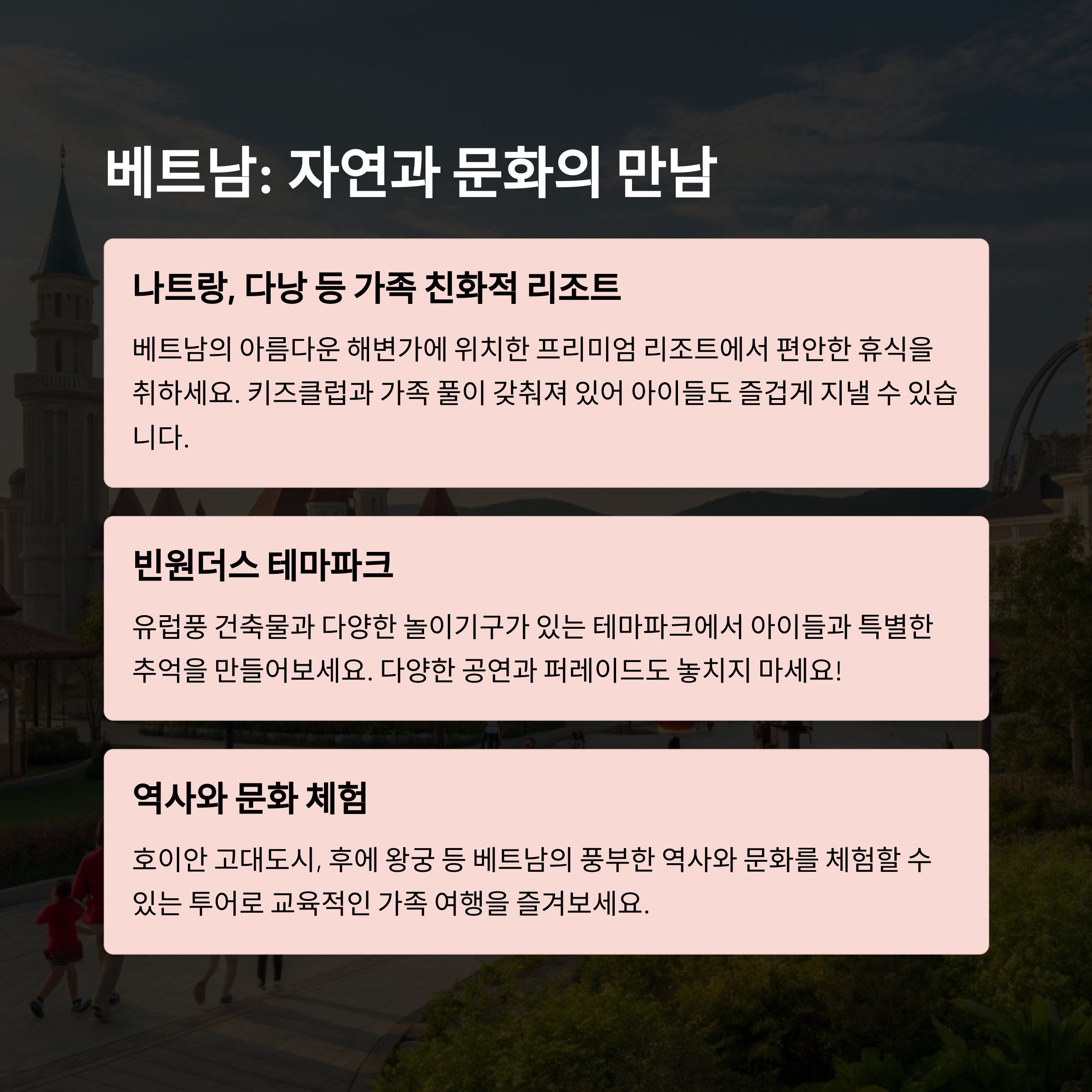 어떤 여행지를 선호하시나요? 가족 여행을 계획할 때 가장 중요하게 생각하는 포인트는 무엇인지 댓글로 남겨주세요. 여러분의 후기가 또 다른 가족의 여행을 더 행복하게 만들 수 있습니다!