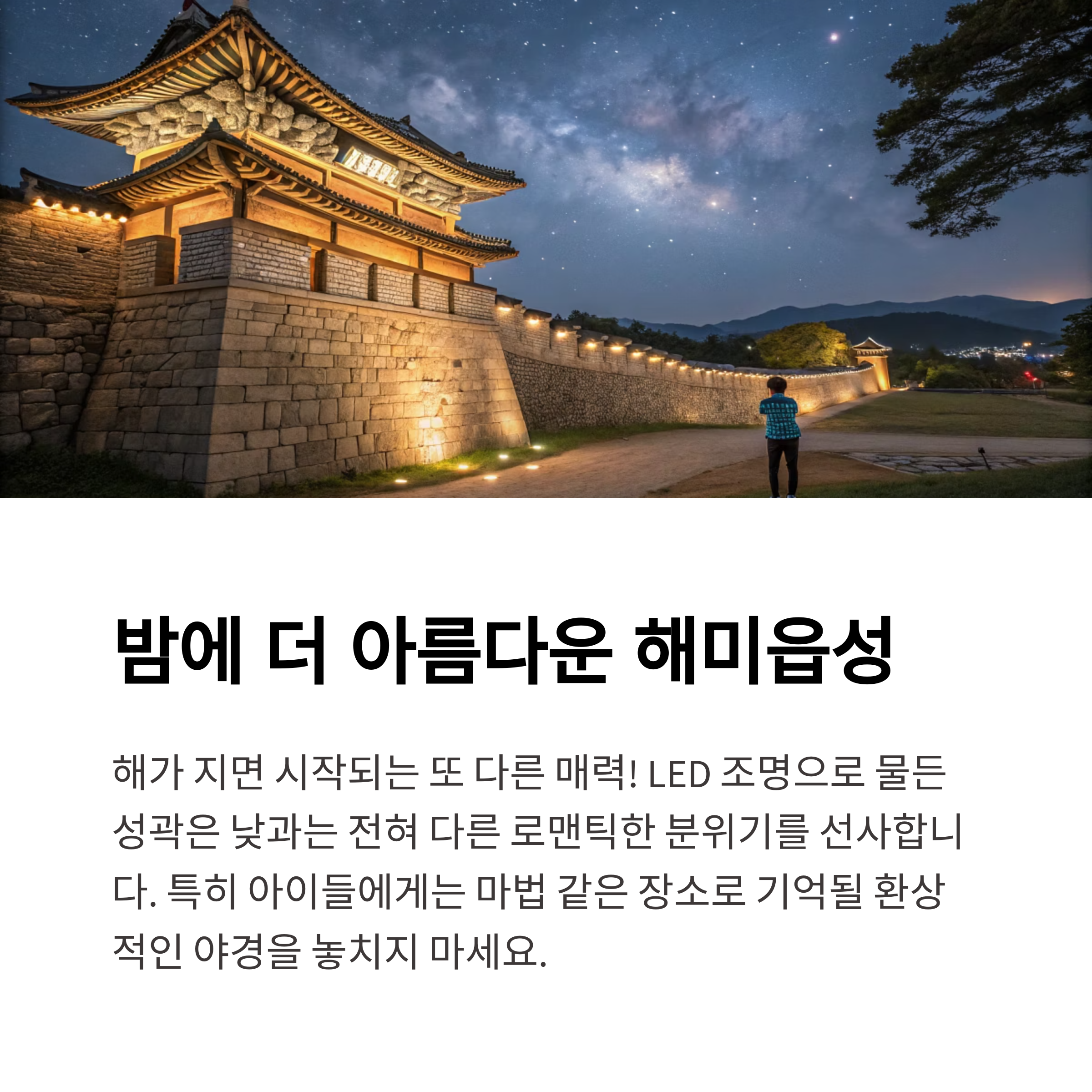 해미읍성의 진정한 매력은 그저 걷기만 해도 힐링이 되는 경관입니다. 성 안을 산책하며 마주한 대나무 숲과 무궁화동산은 사진을 찍기에도 좋은 장소였고, 곳곳에 마련된 포토존은 인생샷 명소로 손색이 없었습니다. 특히 아이들과 연을 날릴 수 있는 넓은 공간은 도시에서는 쉽게 경험할 수 없는 특별한 재미를 선사해주었습니다. 연을 현장에서 구입할 수도 있고, 본인이 준비한 연을 펼쳐보는 것도 가능했습니다. 야간 경관 조명은 환상적이었는데, 성곽 전체를 따뜻한 빛으로 감싸는 LED 조명이 해가 진 후에도 많은 방문객을 머물게 했습니다.