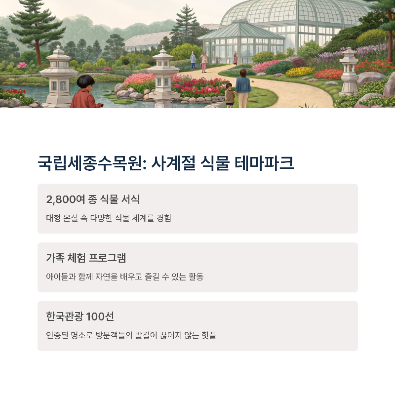 다음으로 방문한 국립세종수목원은 도시 속 정원이라는 개념을 완벽하게 구현한 곳이었습니다. 입구를 지나면 바로 웅장한 온실이 눈에 띄는데, 그 안에는 사계절 내내 다양한 식물을 관람할 수 있도록 설계되어 있었습니다. 특히 아라홍련 특별전은 감탄이 절로 나올 만큼 아름다웠고, 전통정원과 분재원의 구성이 조화로워 사진 찍기에도 제격이었죠. 실내외 공간이 조화를 이루며 전시도 잘 구성되어 있어서 단순한 산책 이상의 경험을 선사합니다. 체험 프로그램도 다양해 아이들과 함께 오기에도 정말 좋은 장소였습니다.