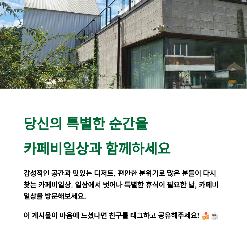 여러분은 세종에 어떤 감성카페를 추천하시나요? 혹시 카페비일상에 방문한 경험이 있다면 어떤 점이 인상 깊었는지 댓글로 자유롭게 나눠주세요. 소중한 경험은 다른 이들에게 큰 도움이 됩니다!