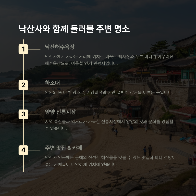낙산사에 가보신 적 있나요? 가장 인상 깊었던 명소나 추천 팁을 댓글로 남겨주세요. 더 많은 분들과 유용한 정보를 나누는 공간이 되었으면 합니다!