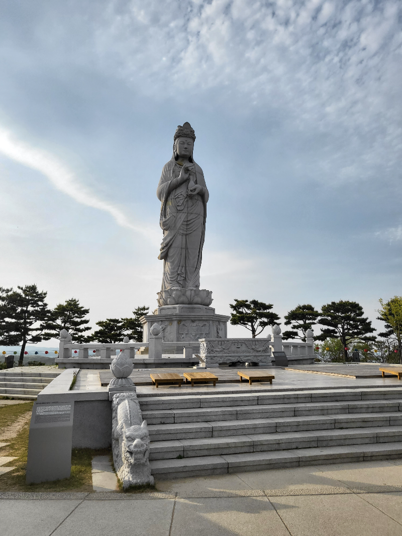낙산사를 처음 방문하신다면 입구부터 천천히 걷는 동선을 추천드립니다. 사천왕문을 지나 빈일루에 다다르면 자연스레 마음이 차분해지고, 원통보전 앞에 이르면 사찰 특유의 고요한 기운이 감돌기 시작하죠. 가장 인상 깊었던 공간은 단연 해수관음상이었습니다. 동해를 바라보며 우뚝 선 16m 높이의 이 불상은 위압감보다도 포근함을 전해줍니다. 관세음보살의 자비로움이 전달되는 듯한 느낌이랄까요? 특히 바다를 배경으로 사진을 찍으면, 그 자체로 힐링 엽서가 완성됩니다.