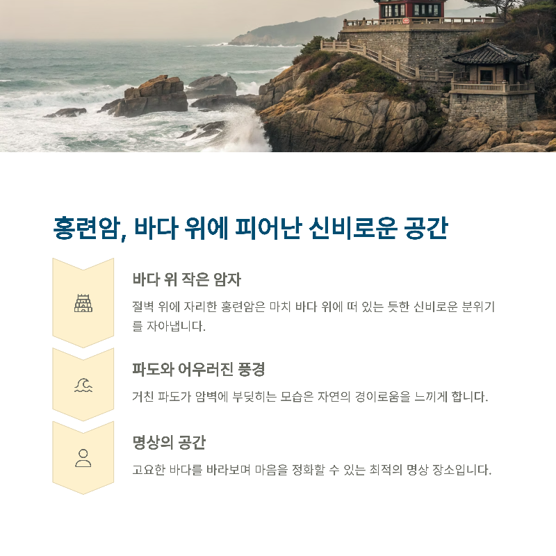 | 1977년 완공, 108법률석과 조각상 포함 | 의상대사 수행처, 겸재 정선의 그림 배경 | 바람소리와 파도소리의 힐링 명소 |