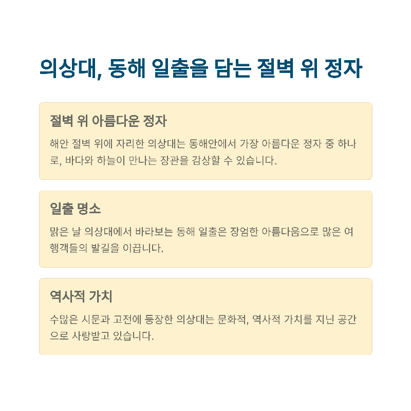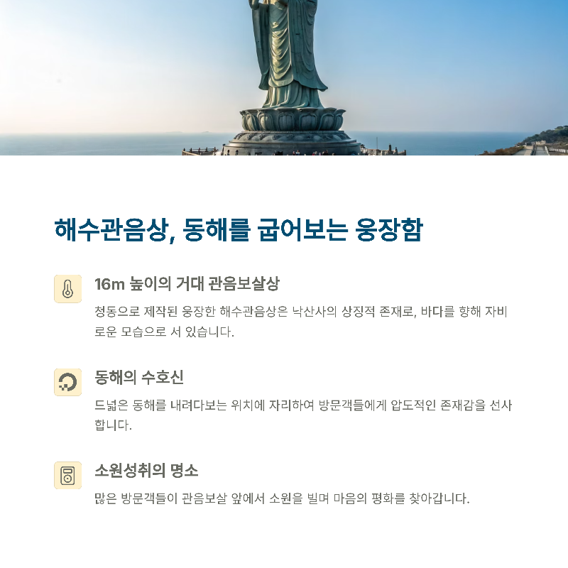 | 동양 최대 단일 불상, 바다를 향한 자태 | 정자형 건물, 동해 일출 최고의 포인트 | 절벽 위 기도처, 바다와 어우러진 풍경 |