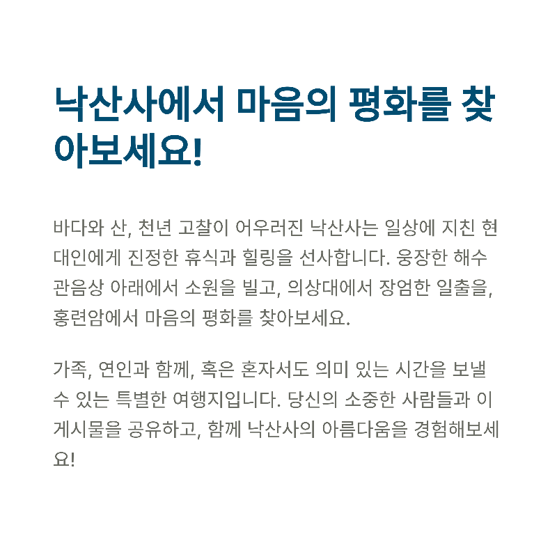 낙산사에 가보신 적 있나요? 가장 인상 깊었던 명소나 추천 팁을 댓글로 남겨주세요. 더 많은 분들과 유용한 정보를 나누는 공간이 되었으면 합니다!