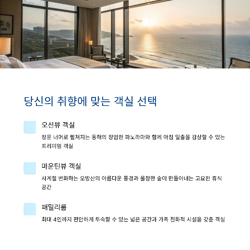 | 객실 뷰 | 오션뷰, 숲뷰, 마운틴뷰 등 다양한 자연 조망 가능 |