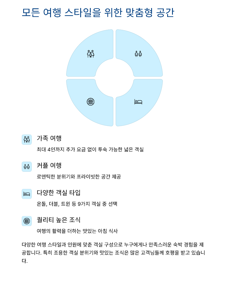 | 아침 산책 코스로도 제격 | 커플여행에 로맨틱한 분위기 연출 | 가족 단위 여행자에게도 만족도 높음 |