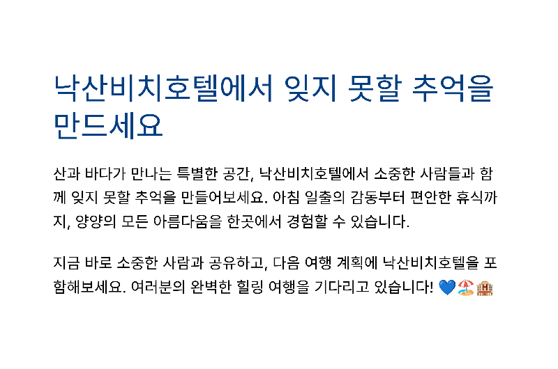 여러분도 낙산비치호텔에 다녀오셨다면 어떠셨나요? 혹은 궁금한 점이 있다면 댓글로 자유롭게 남겨주세요. 직접 다녀온 후기로 정보를 나누고, 다른 여행자분들께도 도움이 될 수 있길 바랍니다.