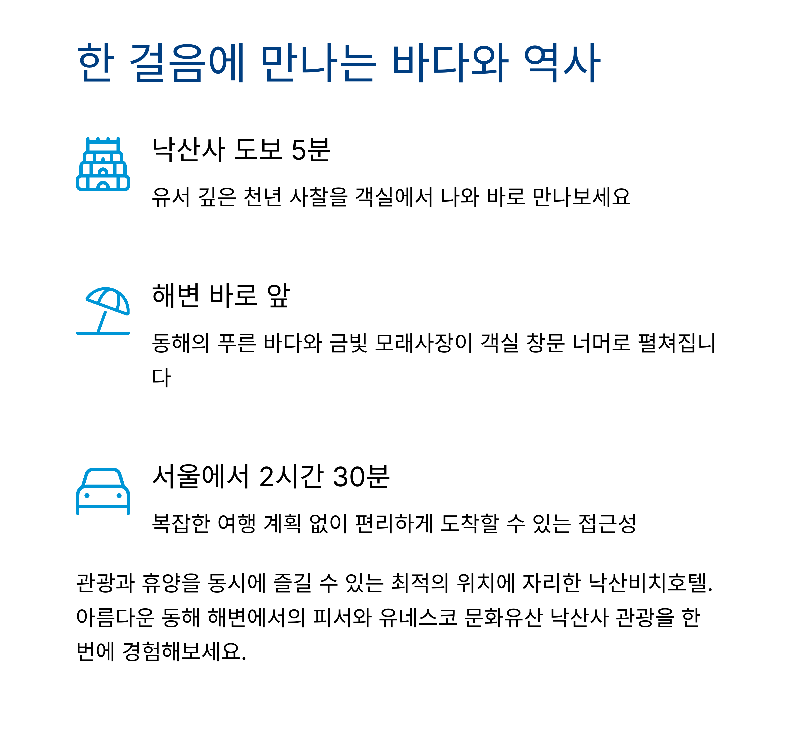 | 낙산사 접근성 | 오션뷰 감상 | 부대시설 다양성 |