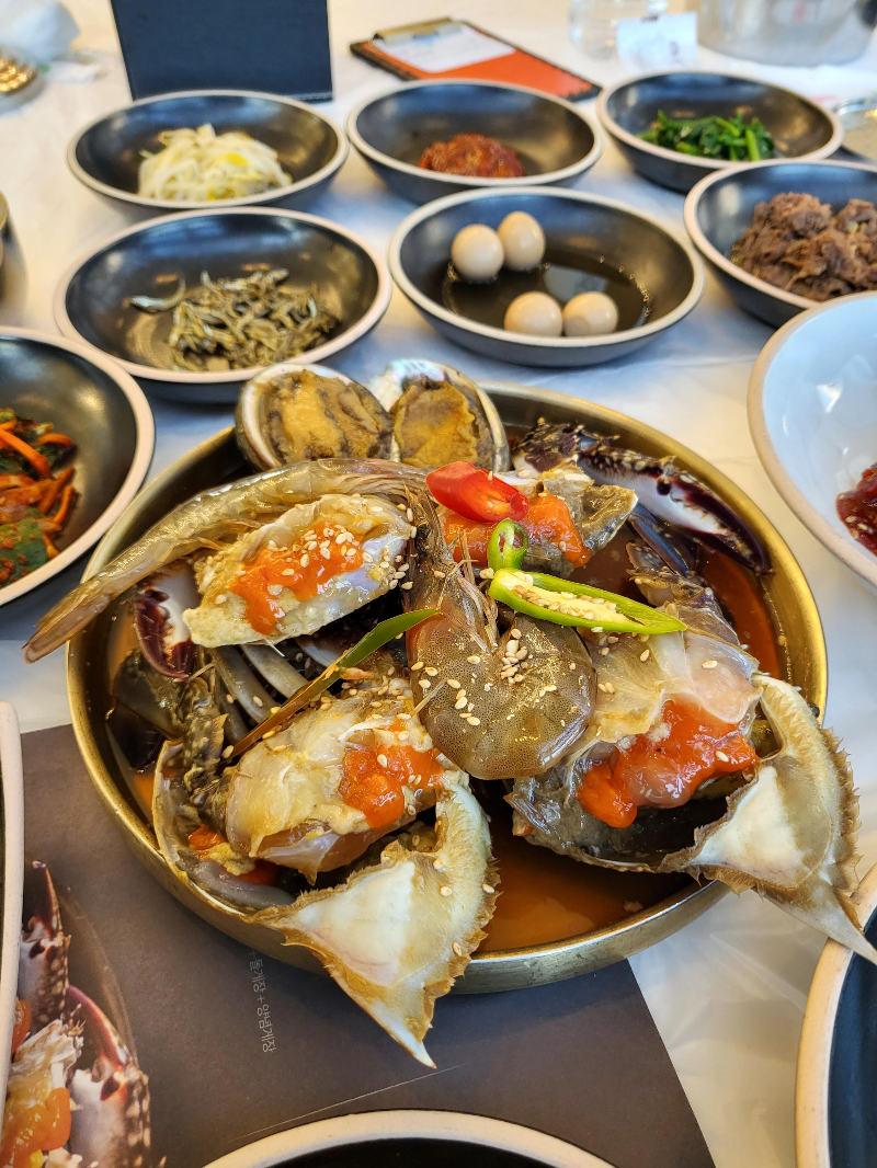 제가 주문한 메뉴는 암꽃게장 정식이었습니다. 살이 꽉 찬 암꽃게가 짜지 않게 잘 숙성되어 있었고, 고소하고 은은한 간장 맛이 입안을 감싸며 정말 밥도둑이 따로 없었습니다. 돌산 갓김치부터 깻잎, 꼴뚜기젓 등 정갈한 밑반찬 10여 가지는 하나하나 정성스럽게 준비되어 있어, 식사 내내 감동을 느낄 수 있었습니다. 무엇보다 밥이 부족할 정도로 반찬 하나하나가 맛있어서 식사 시간이 정말 행복했습니다.