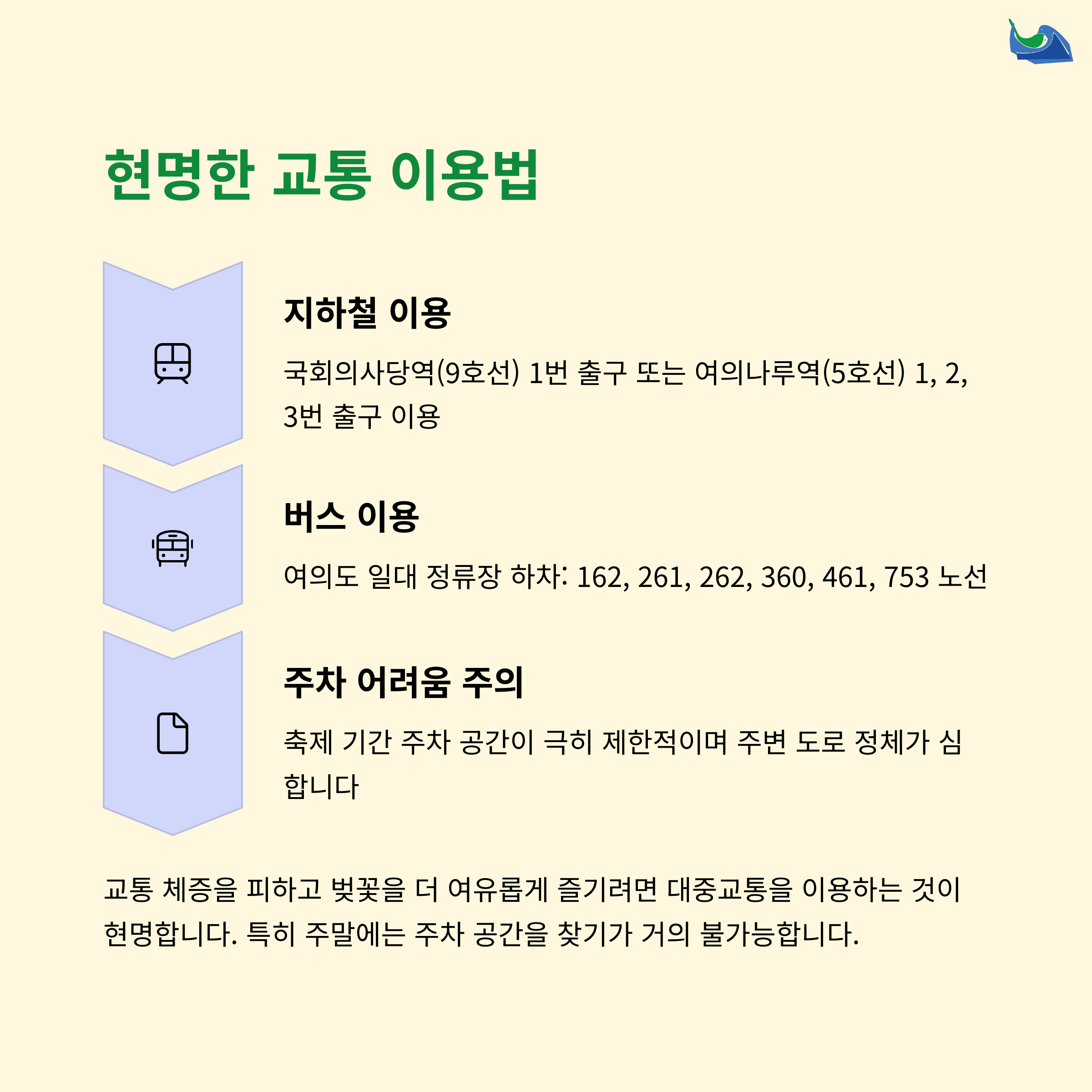 주차는 불가능에 가깝다고 생각하시고 대중교통을 필수로 이용하세요. 국회의사당역과 여의나루역이 가장 가까우며 도보로 5~10분 거리입니다. 편안한 신발과 가벼운 짐은 필수 준비물입니다. 꽃이 만개하는 주말에는 인파가 상당하므로 아이들과 동행 시 더욱 주의가 필요합니다. 자전거 도로가 주변에 있어 보행 시에도 안전에 유의하시기 바랍니다. 좋은 자리에서 앉아 쉬려면 이른 시간 방문을 꼭 추천드립니다.