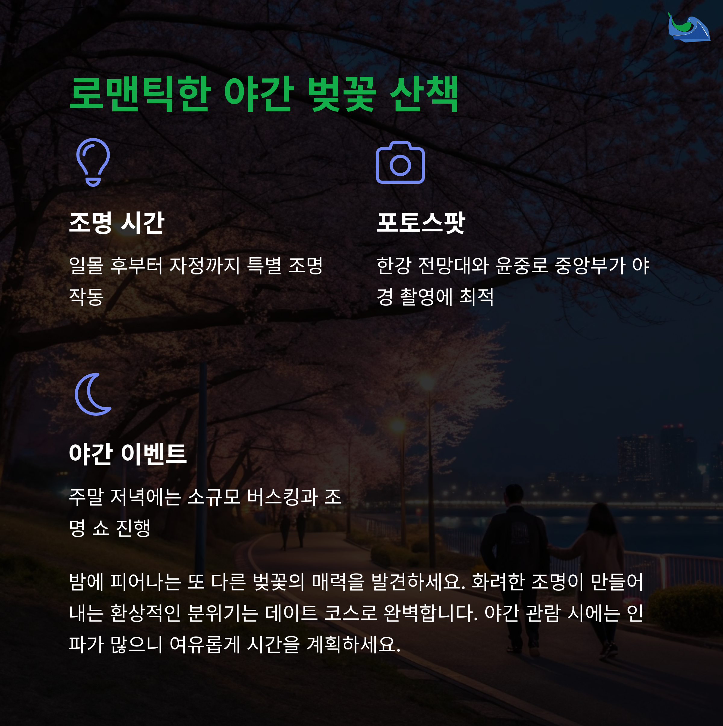 축제 기간에는 다양한 문화 공연과 야간 조명이 준비되어 있어 낮과 밤의 분위기가 다릅니다. 사진 촬영을 좋아하신다면 평일 오전 일찍 방문해 한산한 분위기 속에서 여유롭게 촬영하길 추천합니다. 한강 공원에서는 돗자리를 펴고 벚꽃 아래 소풍을 즐기는 가족 단위 방문객도 많습니다. 도보 이동 중에도 곳곳에 설치된 포토존에서 특별한 추억을 남길 수 있습니다. 야간에는 조명이 벚꽃길을 아름답게 밝혀 또 다른 매력을 선사합니다.