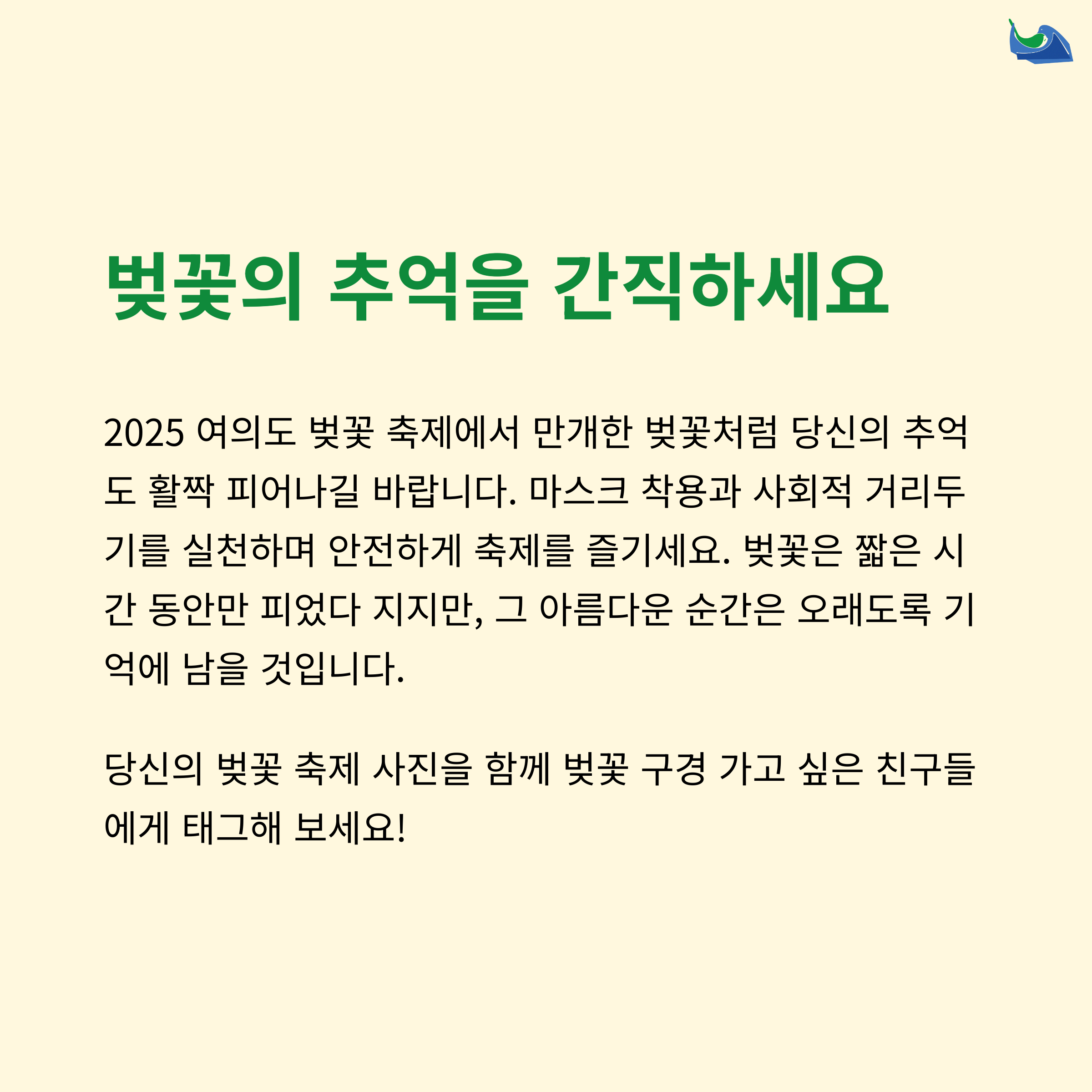 여의도 벚꽃 축제에 대한 여러분의 생생한 경험과 소감이 궁금합니다. 언제 방문하셨는지, 추천하는 시간대나 스팟이 있다면 댓글로 남겨주세요. 더 좋은 정보를 함께 만들어가는 공간이 되길 바랍니다!