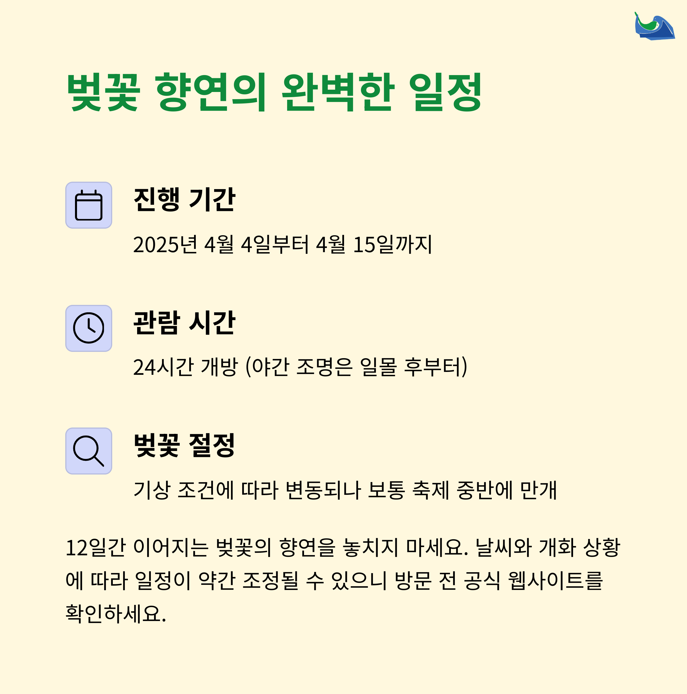 | 개화시기 | 주차정보 | 명당 스팟 |