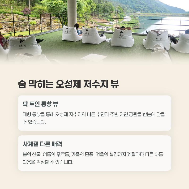 통창뷰 카페 오성제 저수지와 산림이 통창 너머로 펼쳐짐