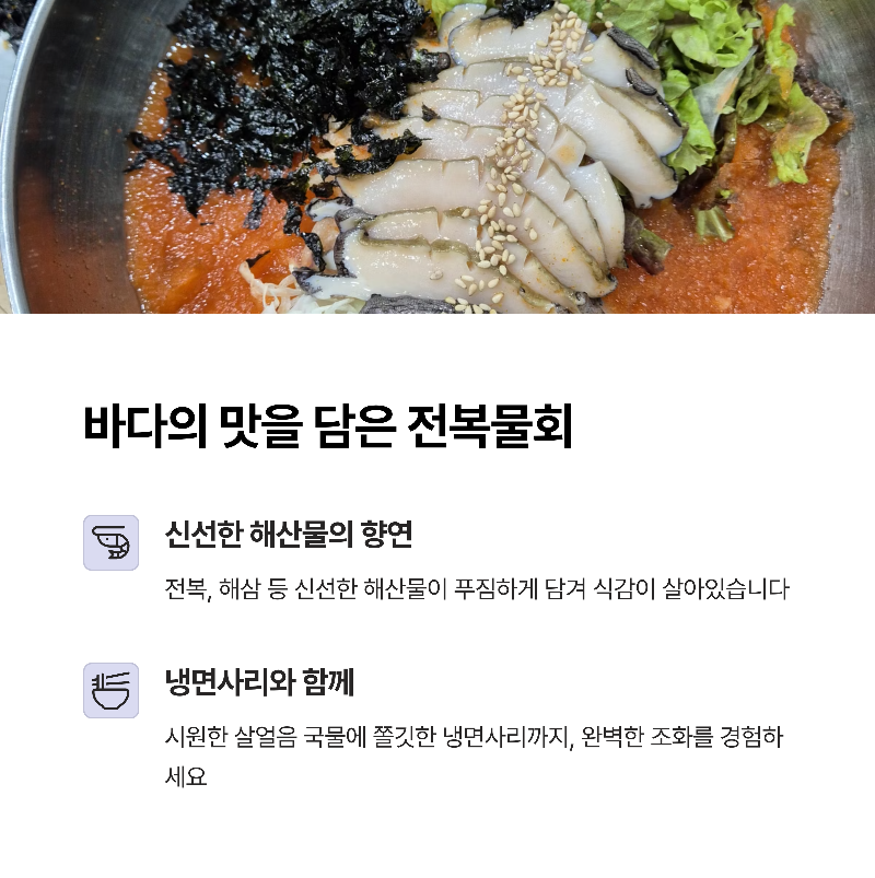 대표메뉴 전복물회, 전복죽, 멍게비빔밥 등 다양한 해산물 요리