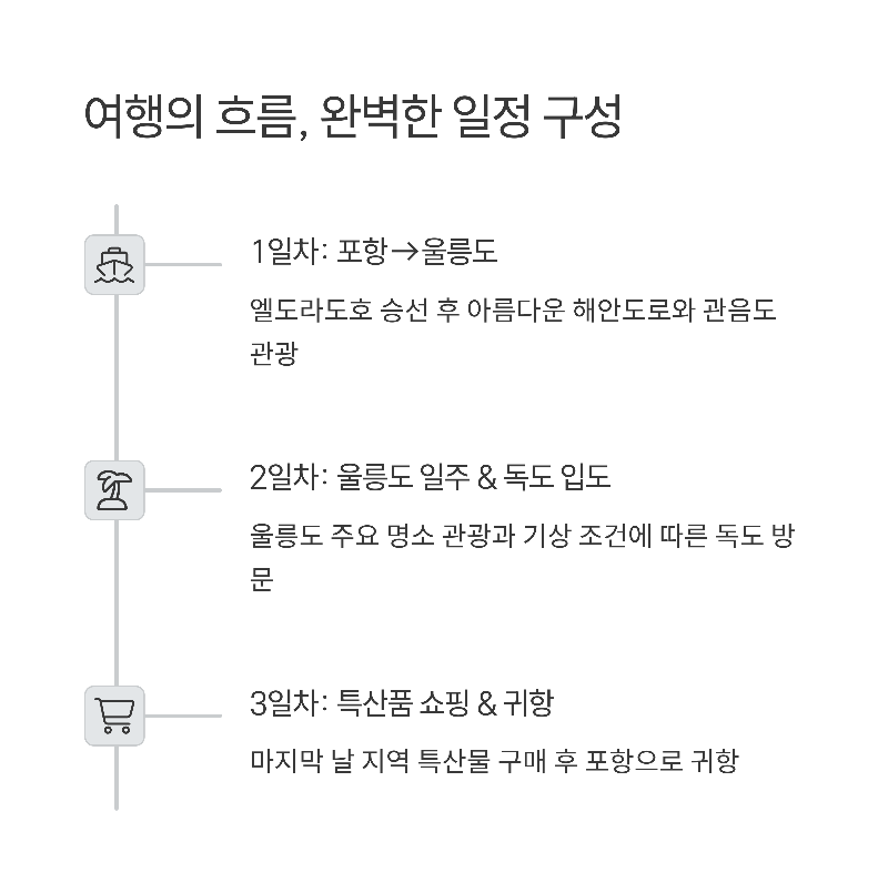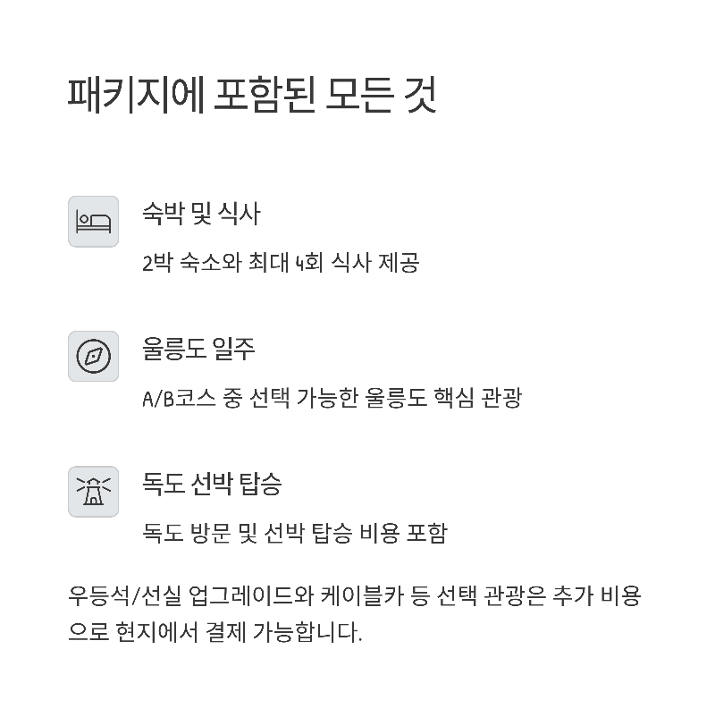 | 2박 3일 일정, 자연 풍경, 독도 입도 체험 | 포항↔울릉 고속 운항, 멀미 적은 최신 선박 | 최소 35만 원부터, 선택 관광 포함시 50만 원 내외 |