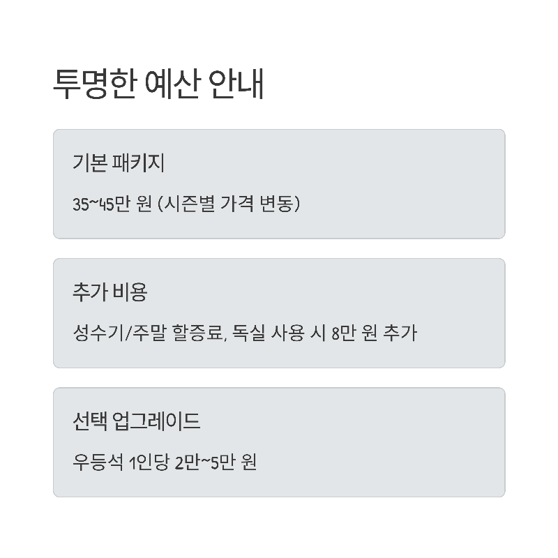 | 숙박, 식사, 관광, 쇼핑 정보까지 정리 완료 | 요금표, 운항 시간표, 탑승 위치 정보 포함 | 여행 전 예산 계획 필수, 식사와 간식비 반영 |