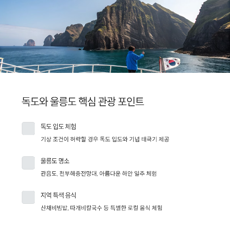 2일차에 진행된 독도 투어는 날씨 운이 따랐던 덕분에 실제 입도가 가능했습니다. 독도경비대의 인사와 태극기 나눔 등 감동적인 경험을 할 수 있었고, 이 순간만으로도 여행의 값어치를 느낄 수 있었습니다. 오후에는 울릉도 내 선택 관광으로 케이블카를 타고 바다를 내려다보며 섬의 아름다움을 만끽했고, 죽도 해안산책로는 조용하고 평화로운 분위기로 힐링을 선사했습니다. 패키지에는 숙박과 기본 식사가 포함되어 있어 편리했으며, 석식은 지역 맛집에서 더덕구이와 따개비비빔밥을 즐겼습니다.