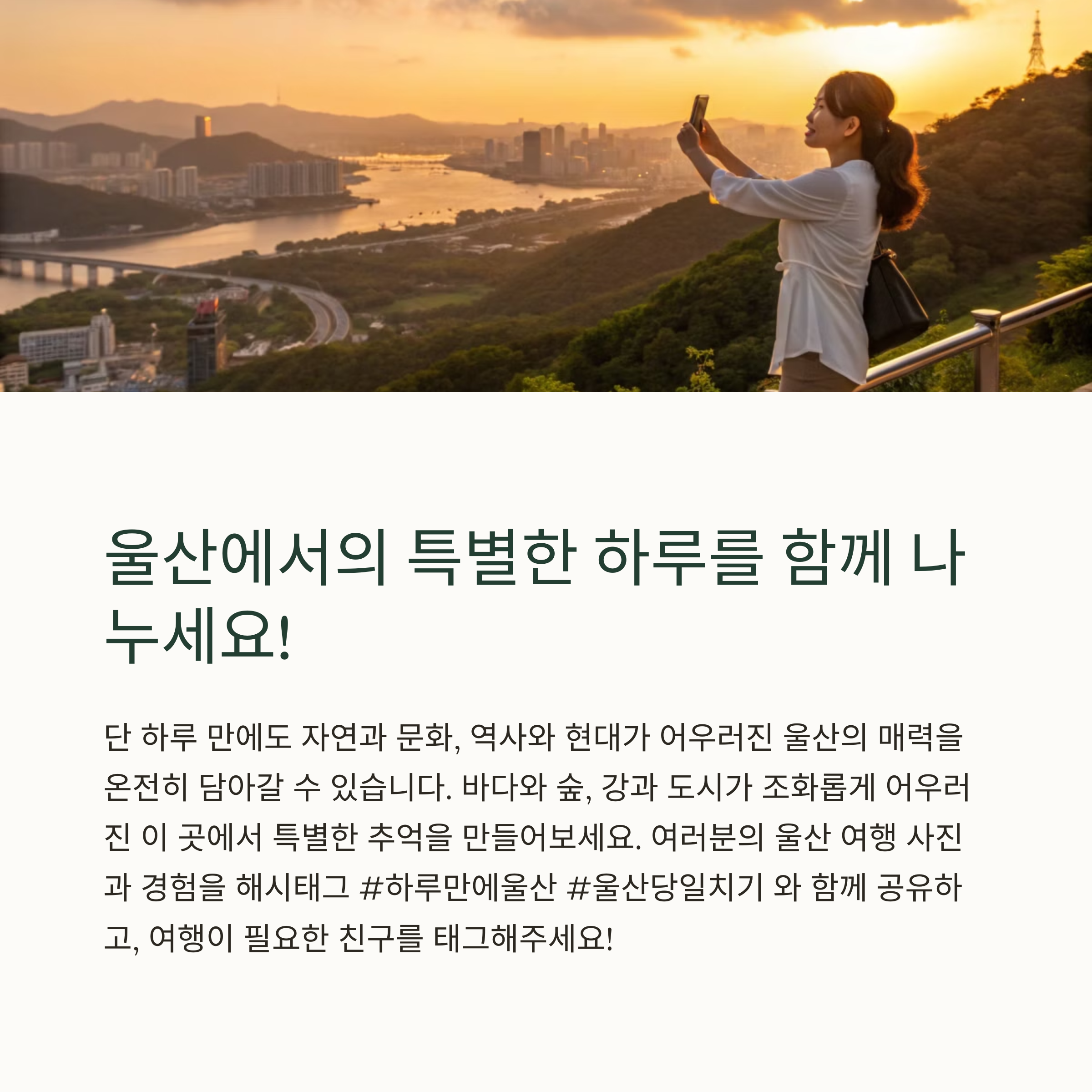 울산은 자연과 문화, 역사가 조화롭게 어우러진 도시로, 당일치기 여행으로도 충분히 즐길 수 있는 여행지입니다. 대왕암공원의 일출과 산책로, 태화강 십리대숲의 힐링 공간, 장생포 고래마을의 독특한 체험까지 모두 경험할 수 있습니다. 이번 여행 코스는 효율적인 일정과 더불어 교통, 식사, 입장료 정보까지 담아 실용성을 높였습니다. 짧은 시간 동안 가족, 연인, 친구와 함께 소중한 추억을 만들고 싶은 분들께 적극 추천합니다. 울산의 아름다움을 만끽하시고, 여행 후에는 따뜻한 후기를 남겨주세요. 여러분의 경험이 또 다른 누군가의 여행에 도움이 될 수 있습니다.