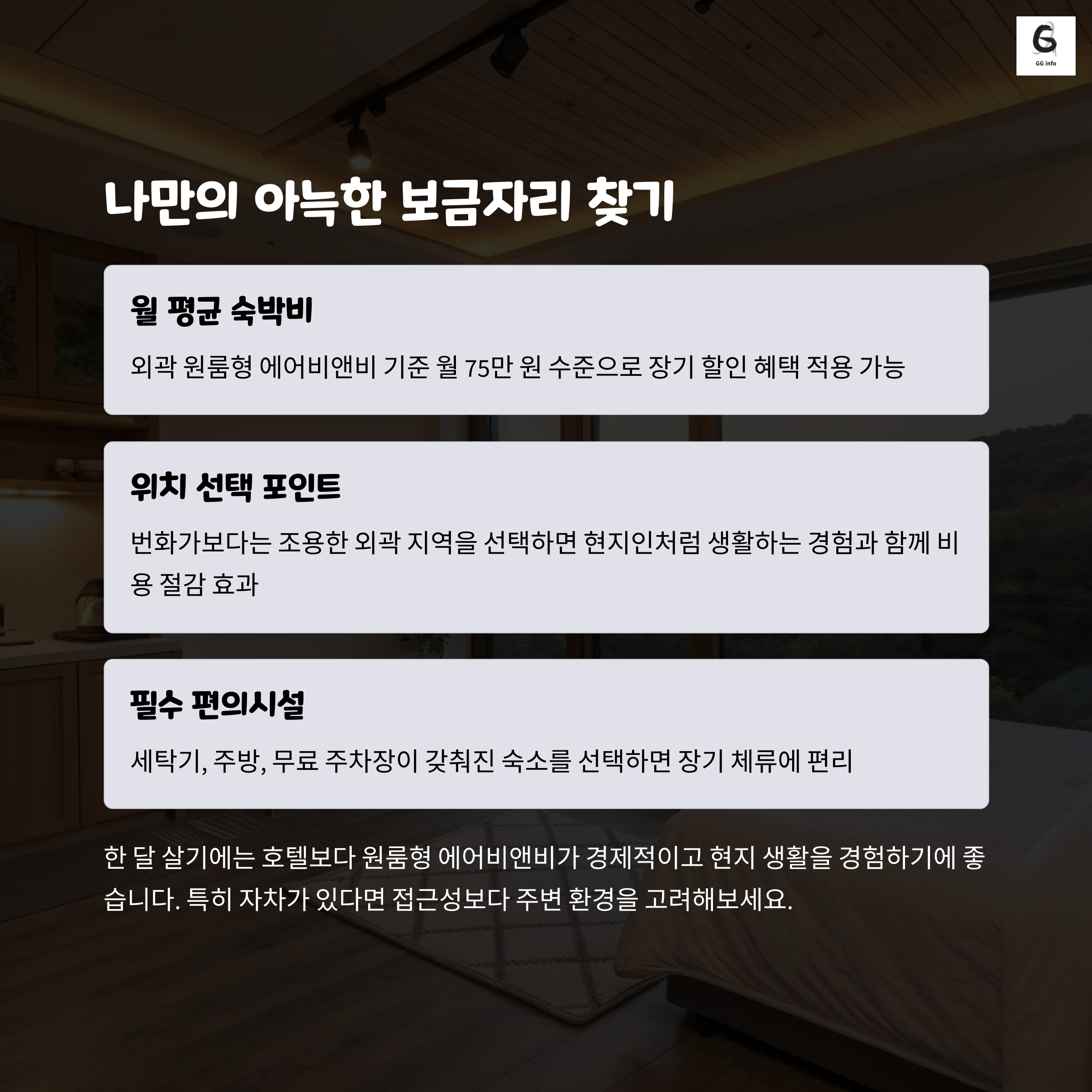 | 숙소 비용 | 숙소 유형과 위치에 따라 월 30만~200만 원까지 다양합니다. |