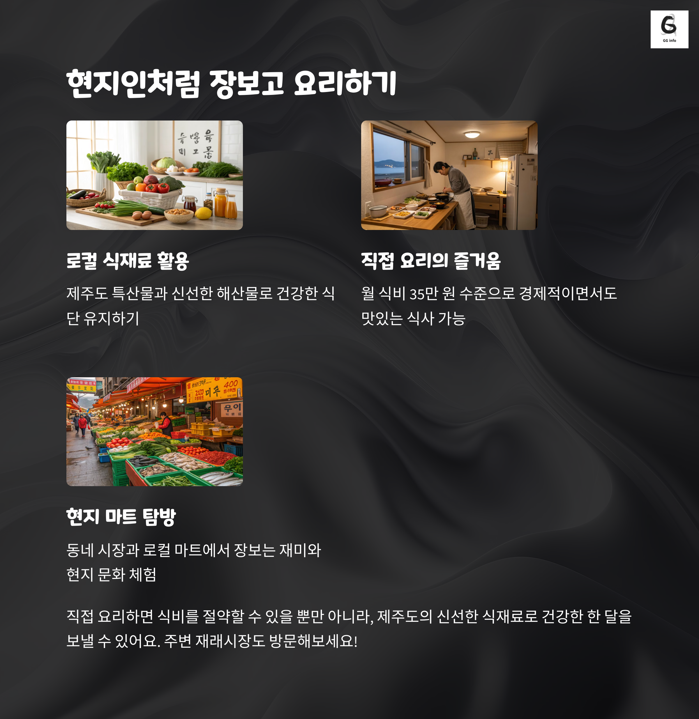 자차를 이용한 덕분에 식비 절약도 가능했습니다. 근처 하나로마트나 전통시장까지 직접 이동해 장을 봤고, 숙소에서 직접 요리를 해 식비는 월 약 35만 원 선으로 유지할 수 있었습니다. 외식을 자주 했다면 60만 원 이상 지출됐을 텐데, 이렇게 실용적인 생활 덕분에 생활비를 꽤 줄일 수 있었죠. 특히 신선한 제주 특산물을 활용한 집밥은 건강에도 좋았고, 여행이 아닌 '삶'을 누리는 느낌이었습니다.