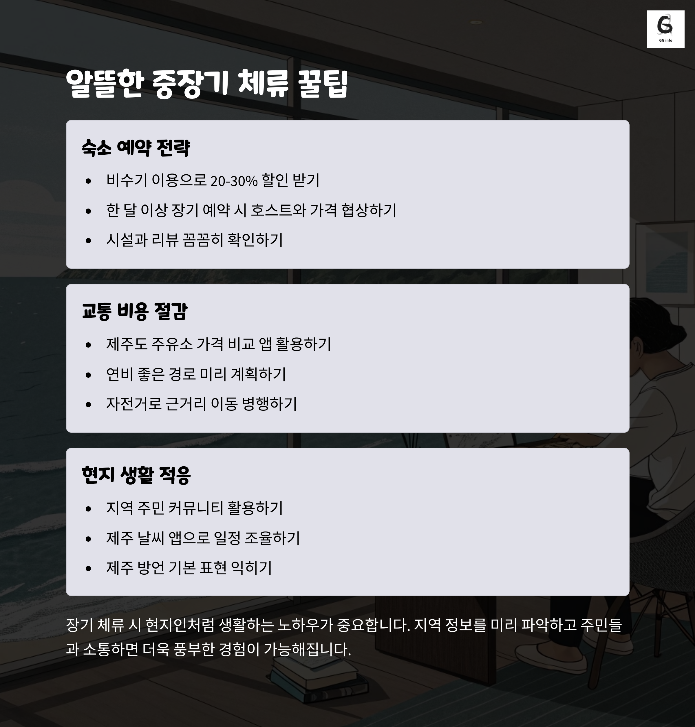 숙소는 제주시 외곽 애월읍에 위치한 원룸형 에어비앤비를 선택했으며, 월 75만 원이었습니다. 주방이 잘 갖춰져 있어 요리에도 불편함이 없었고, 조용한 환경 덕분에 재택 업무와 휴식 모두 만족스러웠습니다. 비수기라 비교적 저렴하게 예약할 수 있었고, 장기 할인 혜택도 적용됐습니다. 만약 접근성과 관광 위주 생활을 원하신다면, 도심 근처 숙소가 유리할 수 있지만 비용은 30% 이상 더 들 수 있습니다. 자차 이동이 가능하다면 외곽 숙소도 충분히 편리합니다.