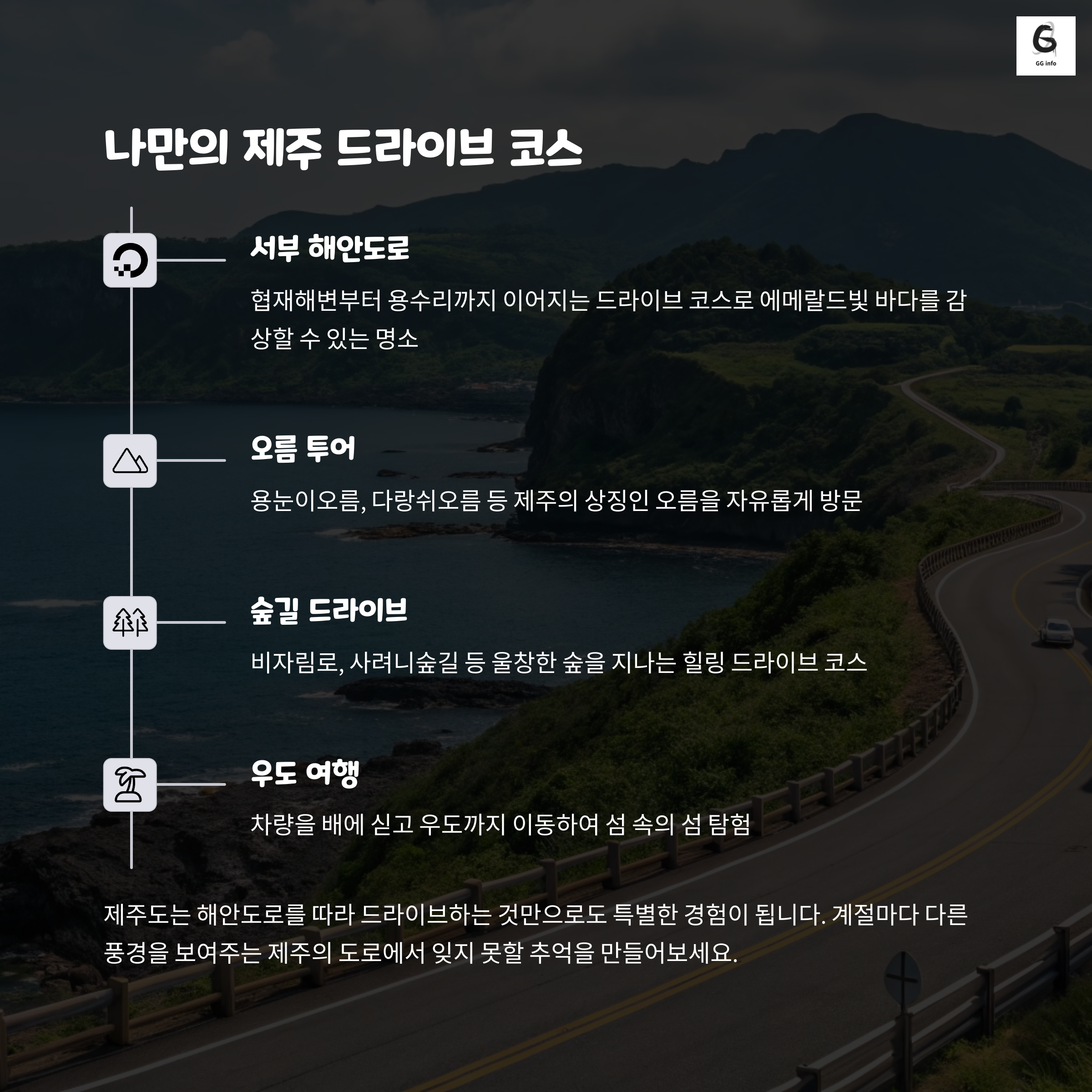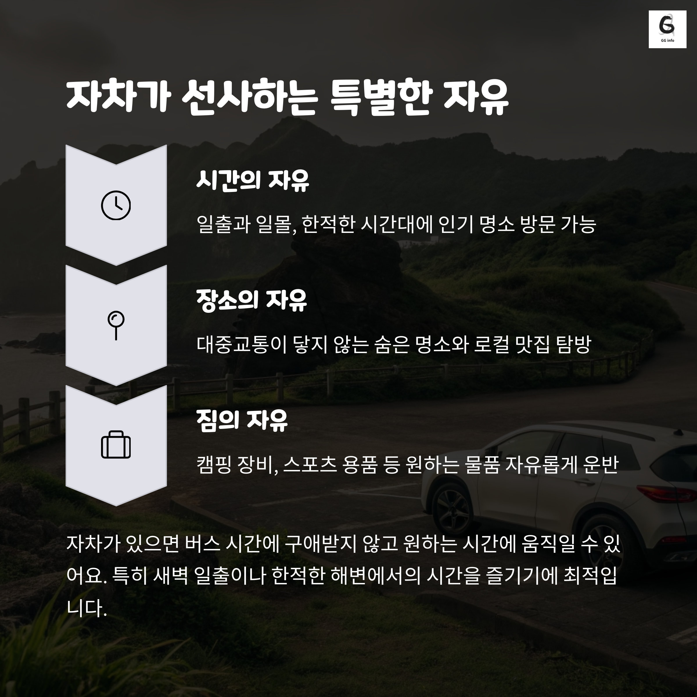 차량을 싣고 떠난 제주 한달살기는 단순한 여행이 아닌 일상의 리셋이었습니다. 숙소 선택, 식비 절약, 교통 자유 등 모든 면에서 예상보다 만족도가 높았으며, 비용 면에서도 렌트 대비 경쟁력 있는 선택이었습니다. 한적한 해변길을 자차로 달리며 즐긴 일상은 지금도 선명하게 남아 있습니다. 단순히 쉼이 필요한 분들뿐 아니라, 원격 근무나 새로운 환경을 꿈꾸는 분들에게도 제주살이는 강력히 추천할 수 있습니다.