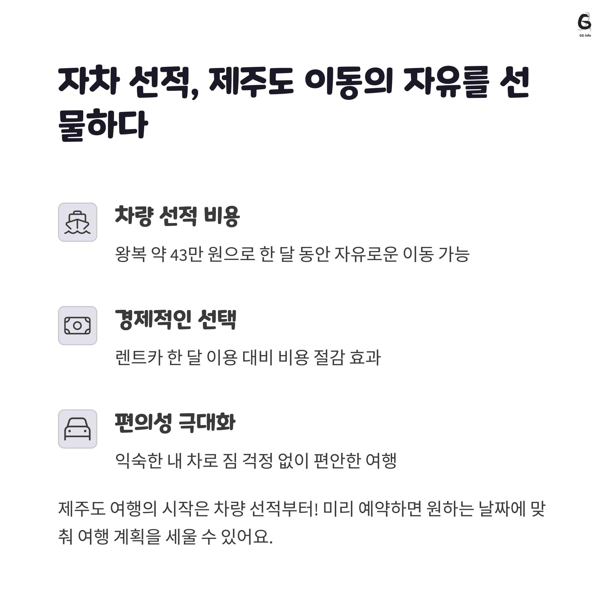 | 대중교통보다 편리, 제주 전역 이동 가능 | 숙소 위치 따라 가격차 큼, 도심은 비쌈 | 외식 줄이고 건강한 식생활 유지에 도움 |