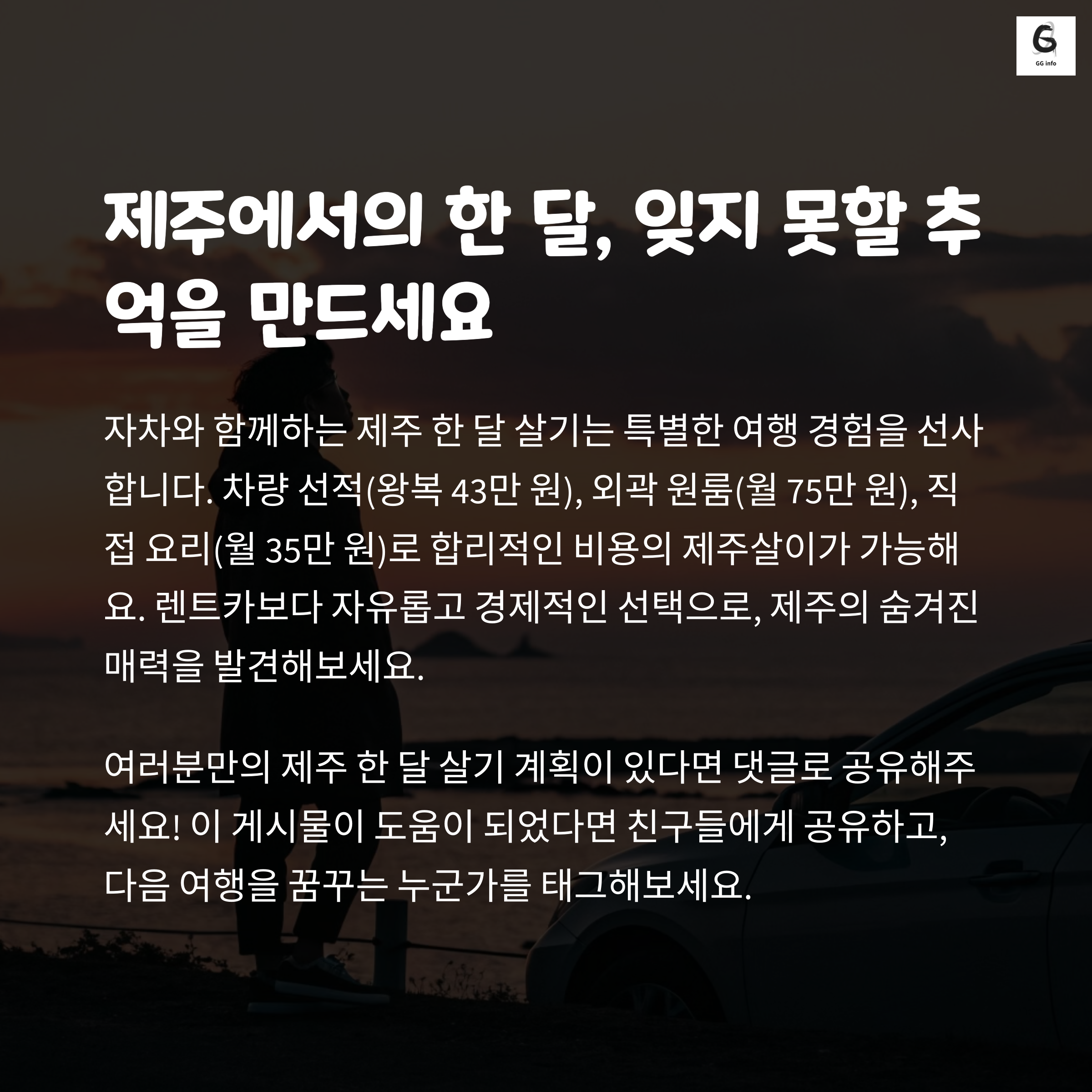 차량을 싣고 떠난 제주 한달살기는 단순한 여행이 아닌 일상의 리셋이었습니다. 숙소 선택, 식비 절약, 교통 자유 등 모든 면에서 예상보다 만족도가 높았으며, 비용 면에서도 렌트 대비 경쟁력 있는 선택이었습니다. 한적한 해변길을 자차로 달리며 즐긴 일상은 지금도 선명하게 남아 있습니다. 단순히 쉼이 필요한 분들뿐 아니라, 원격 근무나 새로운 환경을 꿈꾸는 분들에게도 제주살이는 강력히 추천할 수 있습니다.