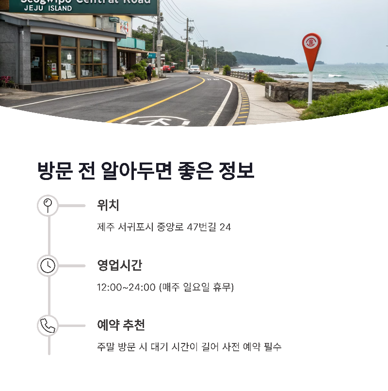 위치 및 정보 제주 서귀포 중앙로47번길 24, 1층. 12:00~24:00 운영, 일요일 휴무.