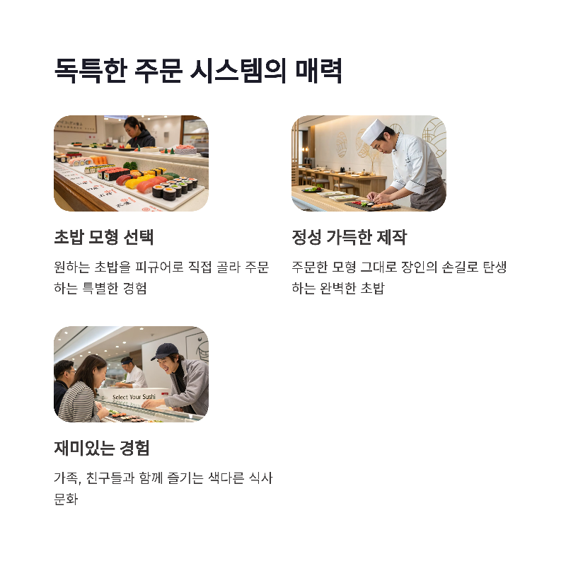 초밥 특징 두툼한 회, 모형 초밥 주문 시스템, 신선도 최고.